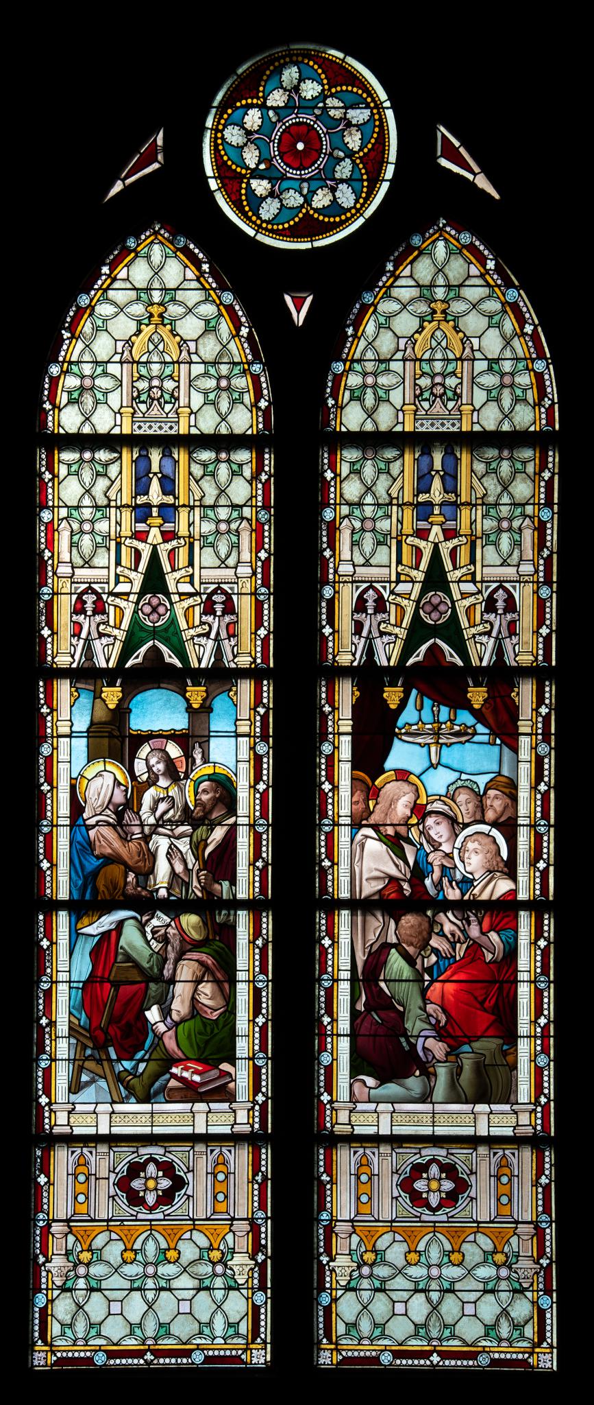 Zweibahniges Spitzbogenfenster im neugotischen Stil mit einfachem Masswerk. In der Mitte des linken Fensters ist der zwölfjährige Jesus im Tempel dargestellt. Jesus sitzt erhöht und erhebt die Hand zum Segensgestus. Vor ihm stehen seine Eltern Maria und Joseph, die ihn nach drei Tagen wiedergefunden haben. Im Vordergrund sitzen zwei Schriftgelehrte, mit denen Jesus diskutierte. In der rechten Fensterbahn ist das Weinwunder zu Kana dargestellt. An der Hochzeit zu Kana verwandelt Christus in Anwesenheit seiner Jünger Wasser in Wein. Vor ihm stehen Maria und Johannes der Evangelist sowie die Hochzeitsgäste. Rahmende, schmale Pfeiler stützen die aus Wimpergen und Fialen gebildeten Bekrönungen. Der Sockelteil zeigt ornamentale Musterungen. Die kreisrunde Öffnung im Masswerk schmückt eine rote Rosette, umgeben von Eichenlaub.
