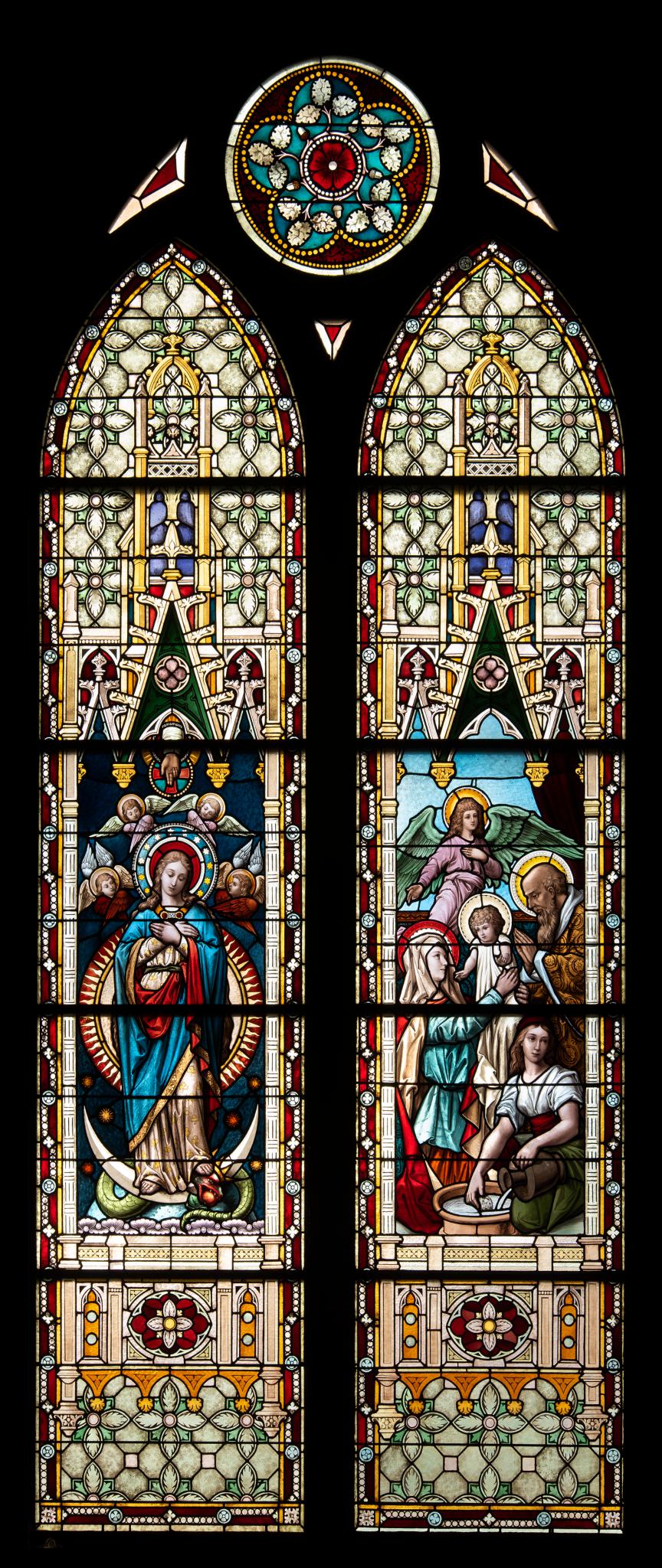 Zweibahniges Spitzbogenfenster im neugotischen Stil mit einfachem Masswerk. In der Mitte des linken Fensters erscheint Maria auf der Mondsichel eine Schlange zertretend. Cherubim und Seraphim umgeben ihr Haupt, darüber erscheint die Hand Gottes. In der Mitte des rechten Fensters ist die Geburt Mariens dargestellt. Anna hält Maria in den Armen, Joachim steht betend gegenüber. Im Vordergrund kniet eine Geburtshelferin mit Waschbecken, im Hintergrund schwebt ein Engel. Rahmende, schmale Pfeiler stützen die aus Wimpergen und Fialen gebildeten Bekrönungen. Der Sockelteil zeigt ornamentale Musterungen. Die kreisrunde Öffnung im Masswerk schmückt eine rote Rosette, umgeben von Eichenlaub.