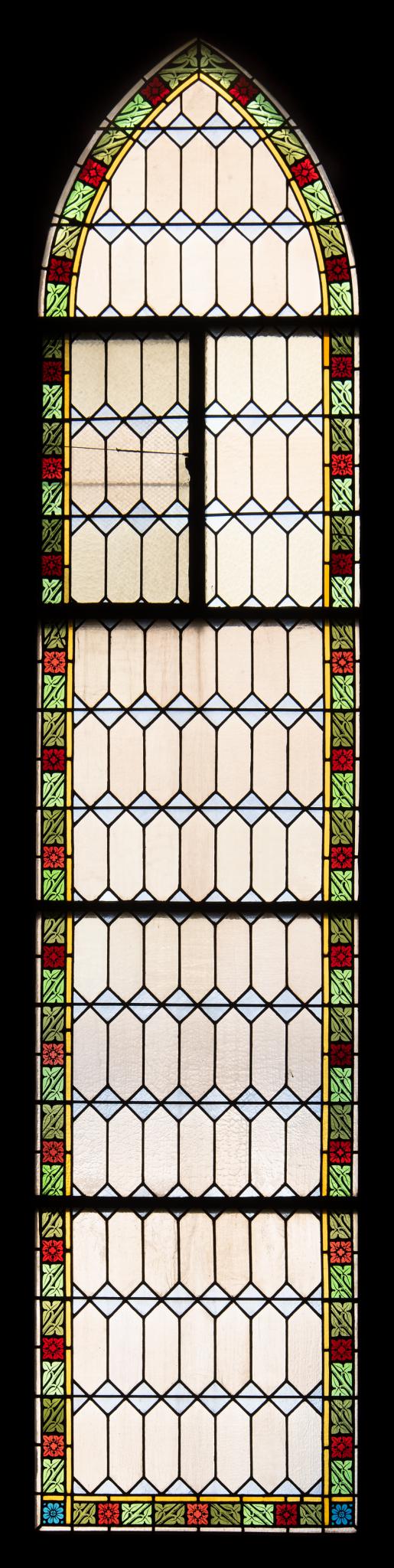 Spitzbogenfenster mit Schweizerrauten und farbiger Rahmung aus gelben und blauen Akanthusblättern.