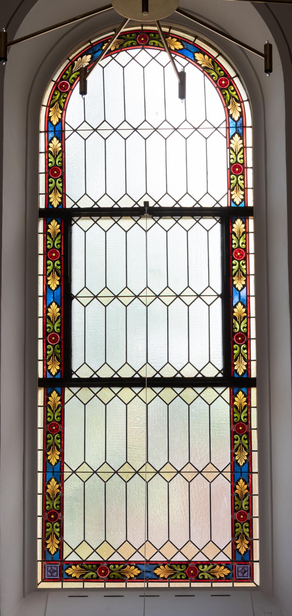 Rundbogenfenster mit Schweizerrauten und farbiger Rahmenverzierung mit Blatt- und Blumenornament in den Farben Rot, Grün, Gelb und Blau (identisch mit s V und n V).