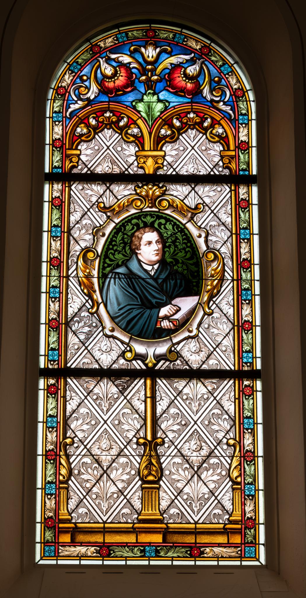 Rundbogenfenster mit Grisaille-Damastmuster (Rautenverglasung), rundbogiger Arkadenrahmung mit Mittelsäule und einem Medaillon mit dem Bildnis Martin Luthers als Bruststück im Zentrum. Der Reformator ist mit Hut, Bibel und Schwert in Seitenansicht dargestellt. Im Bogenfeld üppiges Ranken- und Blumenmotiv, farbige florale Randverzierung. Grundfarben Grün, Blau, Rot und Gelb.