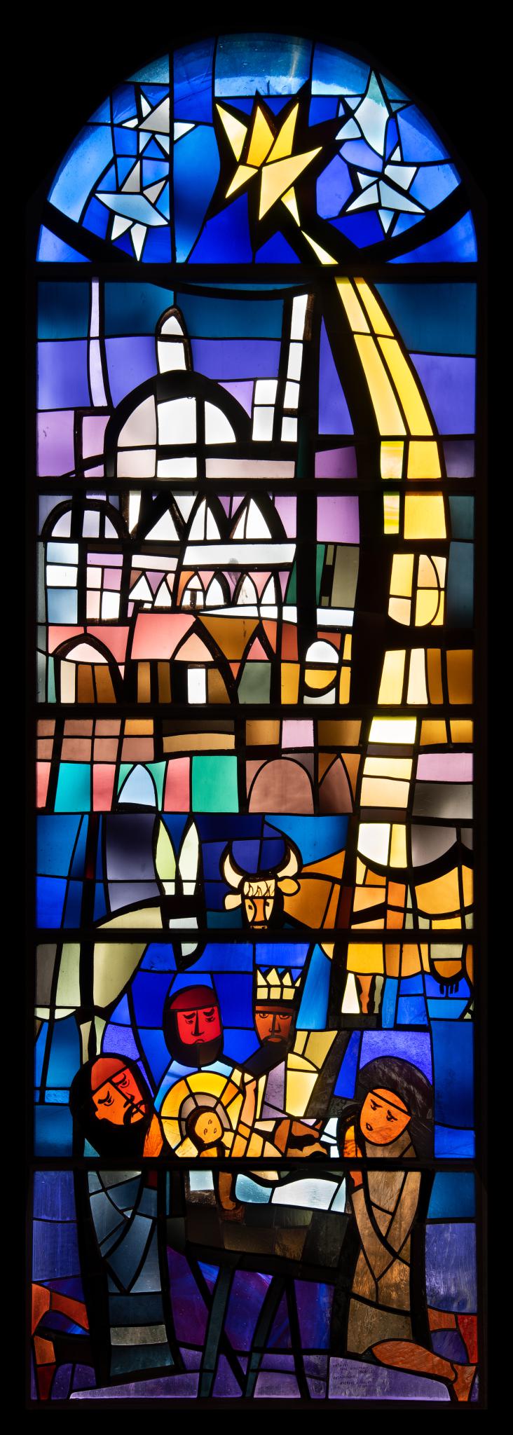 Um das Christuskind in der Krippe knien Maria, Josef, ein Hirte und ein König. Ochs und Esel stehen daneben. Im Hintergrund ist Jerusalem dargestellt. Zuoberst steht der Stern von Bethlehem am Himmel.