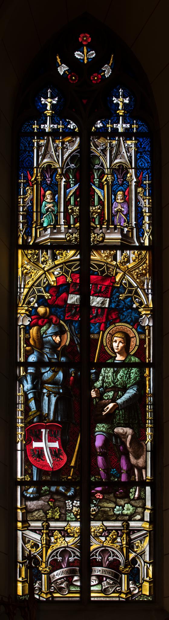 Neugotisch gestaltetes zweilanzettiges Masswerkfenster mit den beiden Heiligen in aufwändiger Rahmung mit gemalten Architekturelementen. Links der heilige Mauritius in stahlblauer Rüstung mit Schild und Lanzenfahne (Kreuzfahne mit den vier Adlern in den Ecken), rechts der heilige Wendelin als Hirte, begleitet von einem Schaf. Im Vordergrund Pflanzendarstellungen, im Hintergrund Teppich mit Rautenmuster, darüber Rankenornament. Die Rahmung im Stile der Gotik mit Fialen und Krabben, in der giebelartigen Bekrönung vor Damasthintergrund zwei kleine Engel (identisch mit s II). Im Couronnement Blumendarstellungen.