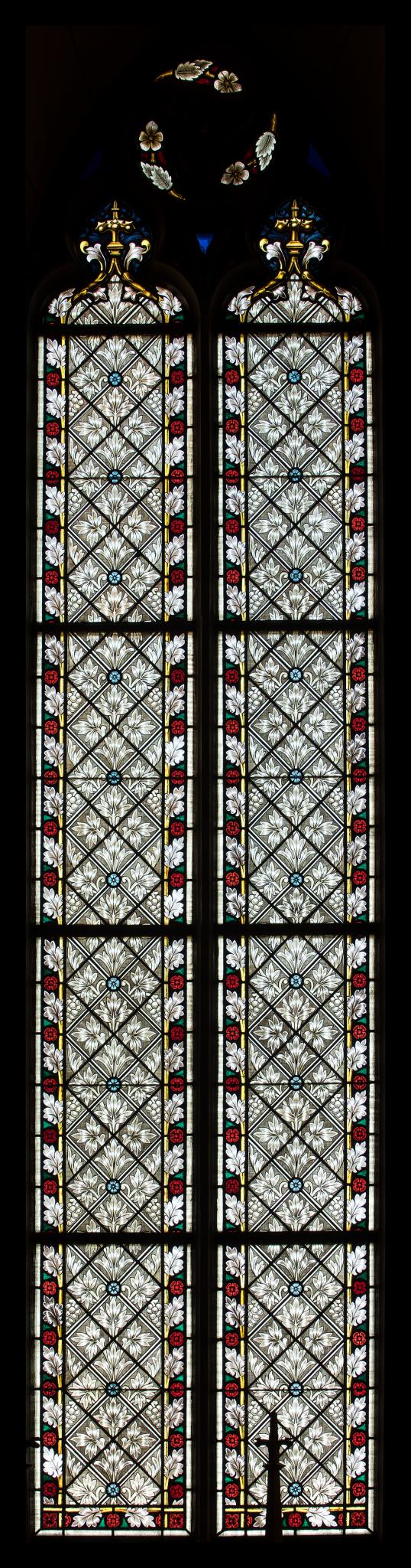 Zweilanzettiges Masswerkfenster mit Rautenverglasung. Die Fensterfläche ist mit einem Grisaillemuster (Blätter und Trauben) dekoriert, die farbige Randverzierung weist stilisierte Blatt- und Blütenmotive auf (identisch mit s IV). An den Kreuzungspunkten der Rauten teils hellblaue Blüten. Masswerk mit farbigen Fialen und Blumendarstellungen.
