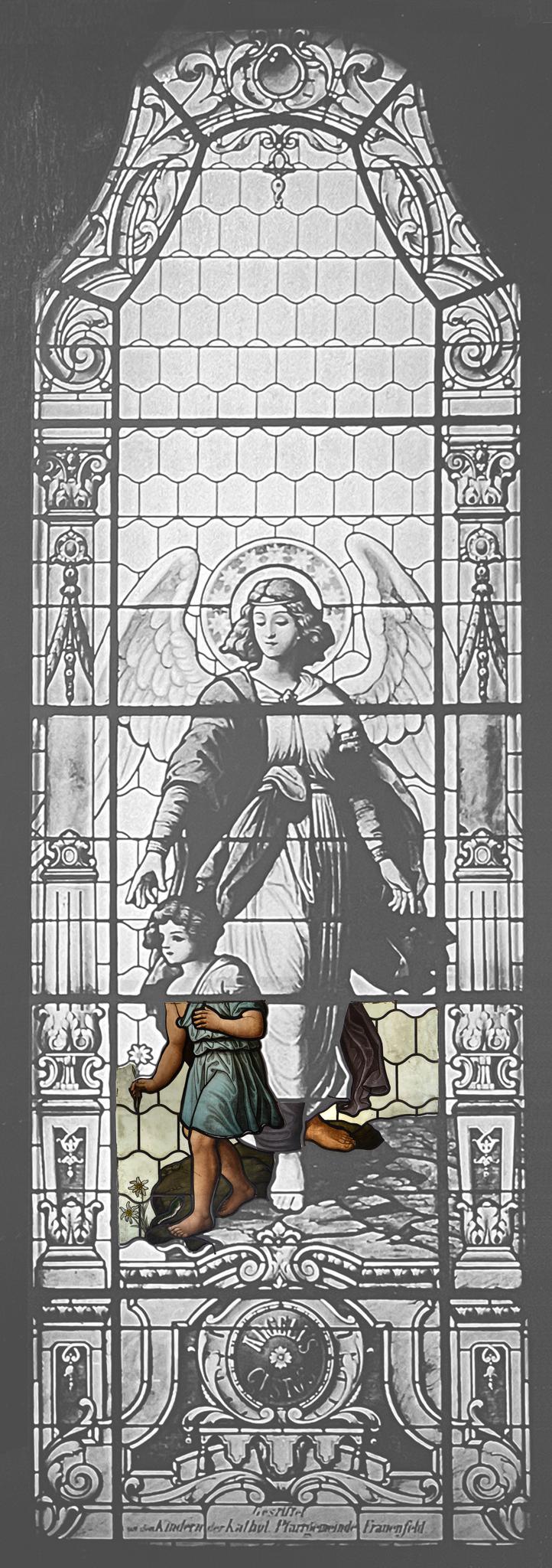 Fragmente einer Fensterverglasung mit der Darstellung eines ein Kind behütenden Schutzengels auf einem architektonisch gestalteten Sockel. Das Kind ist Blumen pflückend in der drohenden Nähe eines Abgrundes und einer Schlange gezeigt, der Schutzengel wacht mit ausgebreiteten Armen über das Kind. Ein breiter Rahmen mit geschmückten Säulen im Stil der Renaissance umfasste ursprünglich das ansonsten blank verglaste Fenster. Im Sockel Medaillon mit Namenszug, an der Sockelbasis Stifterinschrift. Erhalten sind hauptsächlich Teile der Kindesfigur.