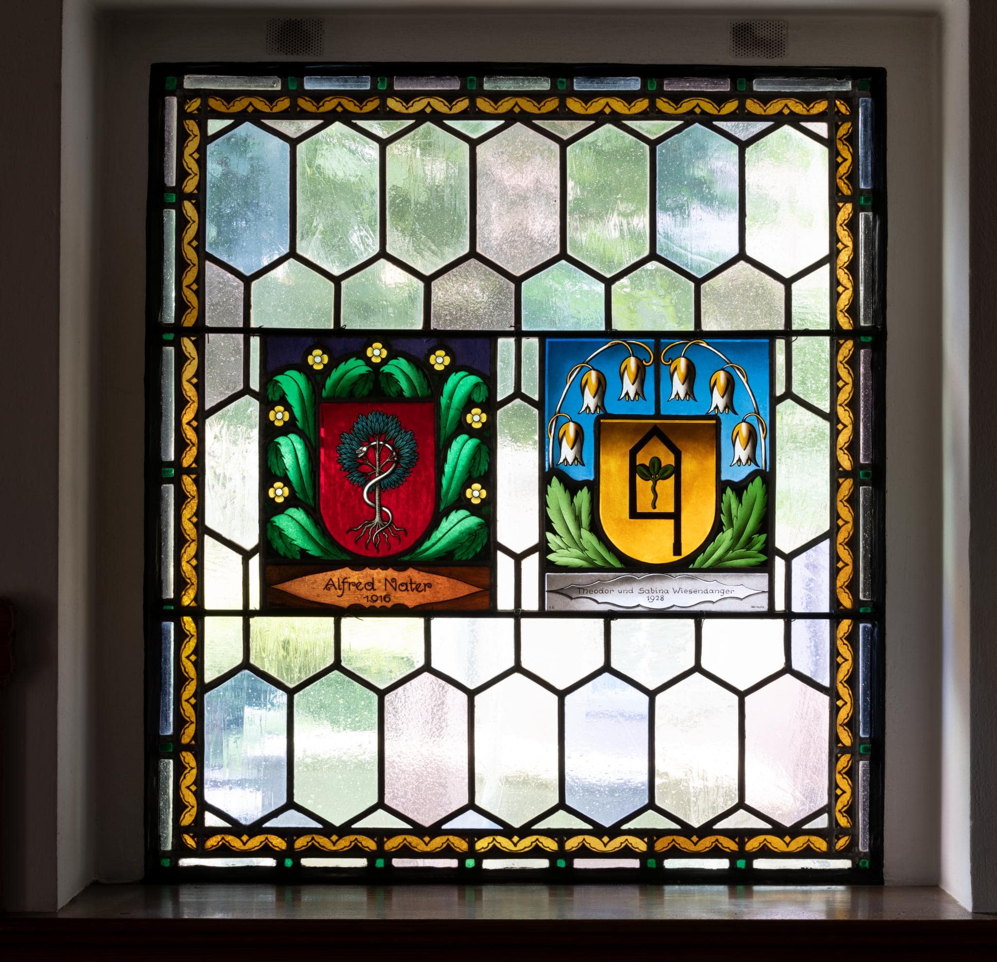Annähernd quadratisches Fenster mit blanker Wabenverglasung und Ornamentbordüre in Gelb und Schwarz. Im Zentrum des Fensters sind zwei Glasmalereien eingelassen: die Wappen Nater und Wiesendanger, umfasst von Blumen.