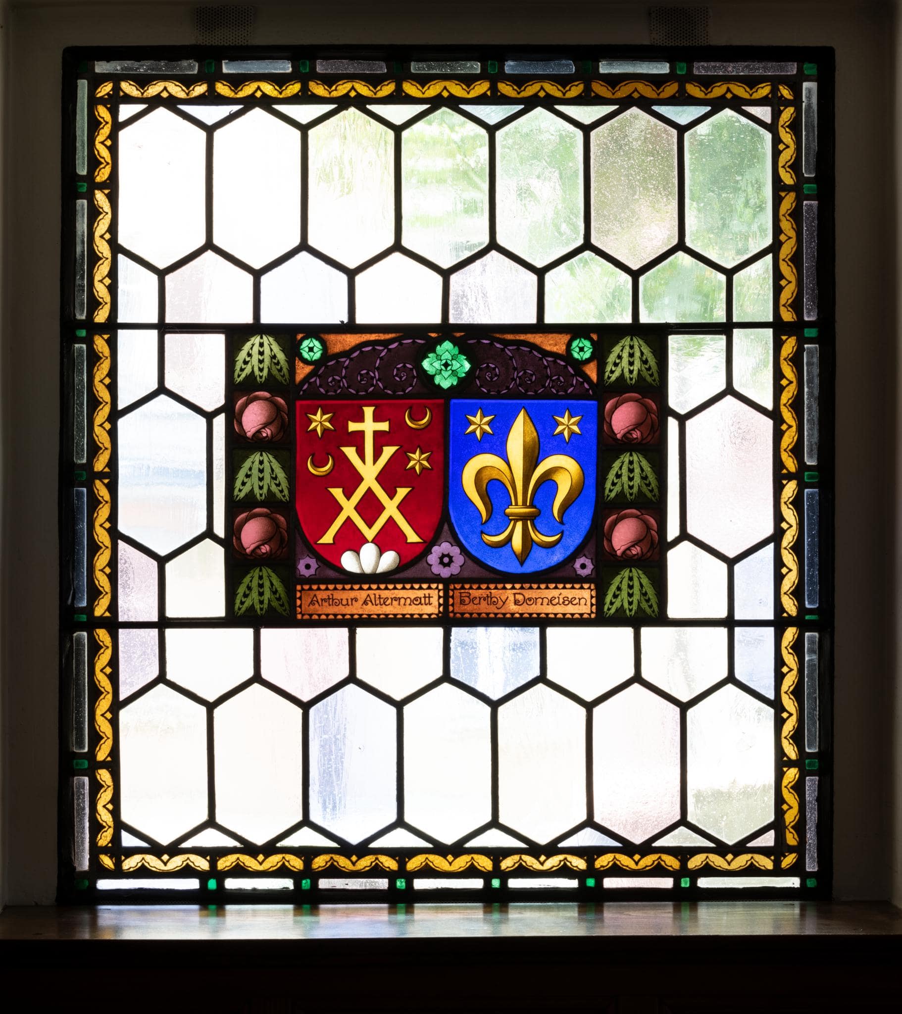 Annähernd quadratisches Fenster mit blanker Wabenverglasung und Ornamentbordüre in Gelb und Schwarz. Im Zentrum des Fensters ist eine Glasmalerei eingelassen: die Wappen Altermatt und Domeisen, umfasst von Blumen.