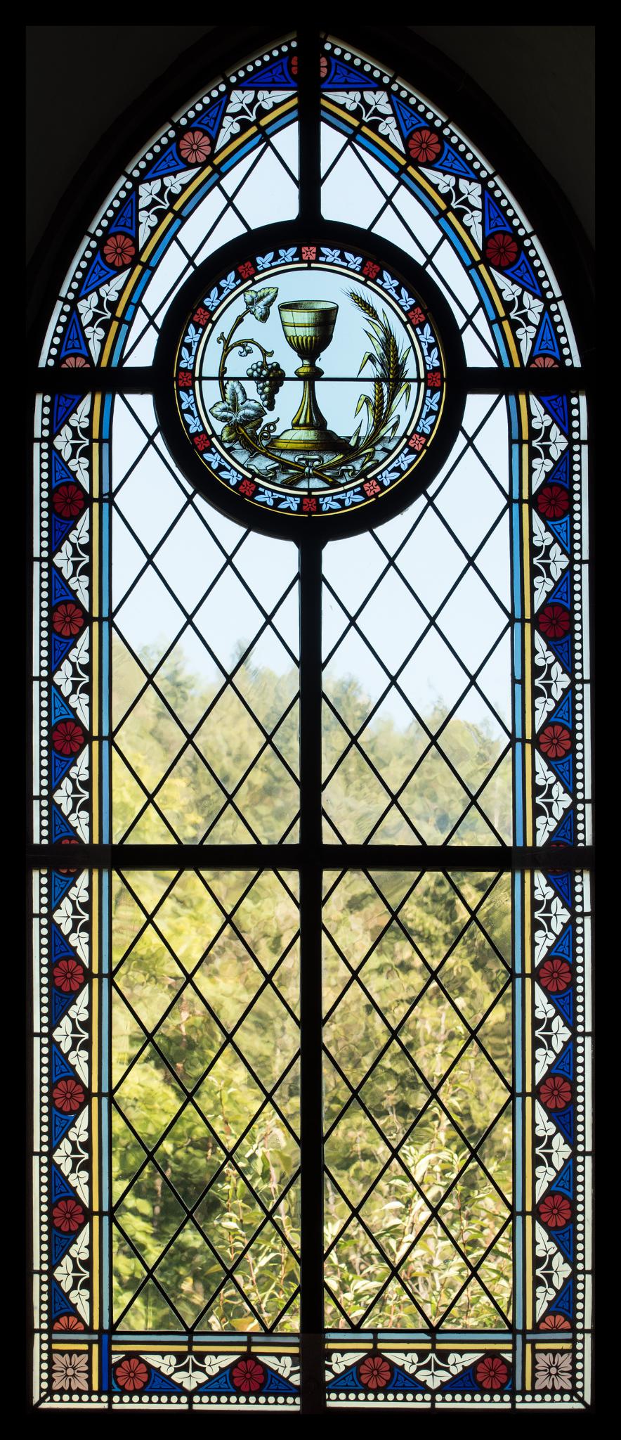 Spitzbogenfenster mit Rautenverglasung und einer Rahmung aus weissen Blattornamenten und roten Blüten. Im Bogenfeld ist ein Medaillon mit Darstellung eines Kelchs, umfasst von Weinrebe und Ähre, eingesetzt.