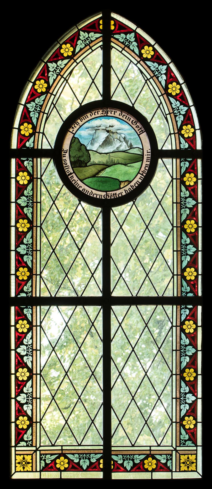 Spitzbogenfenster mit Rautenverglasung und einer Rahmung aus blauen Blattornamenten und gelben Blüten. Im Bogenfeld ist ein Medaillon mit Darstellung einer Landschaft eingesetzt. Im Hintergrund gehen aus einer Wolke Blitze auf einen Berg nieder. Die Bordüre enthält eine Inschrift (das erste Gebot, 2. Mose 20,2–3).