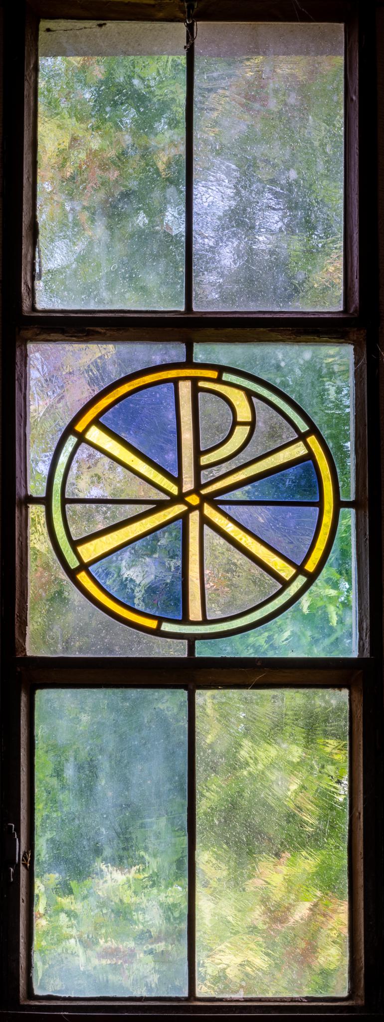 Rechteckiges Fenster aus weissem und hellblauem Antikglas, in der Mitte Chi und Rho in einem Kreis.