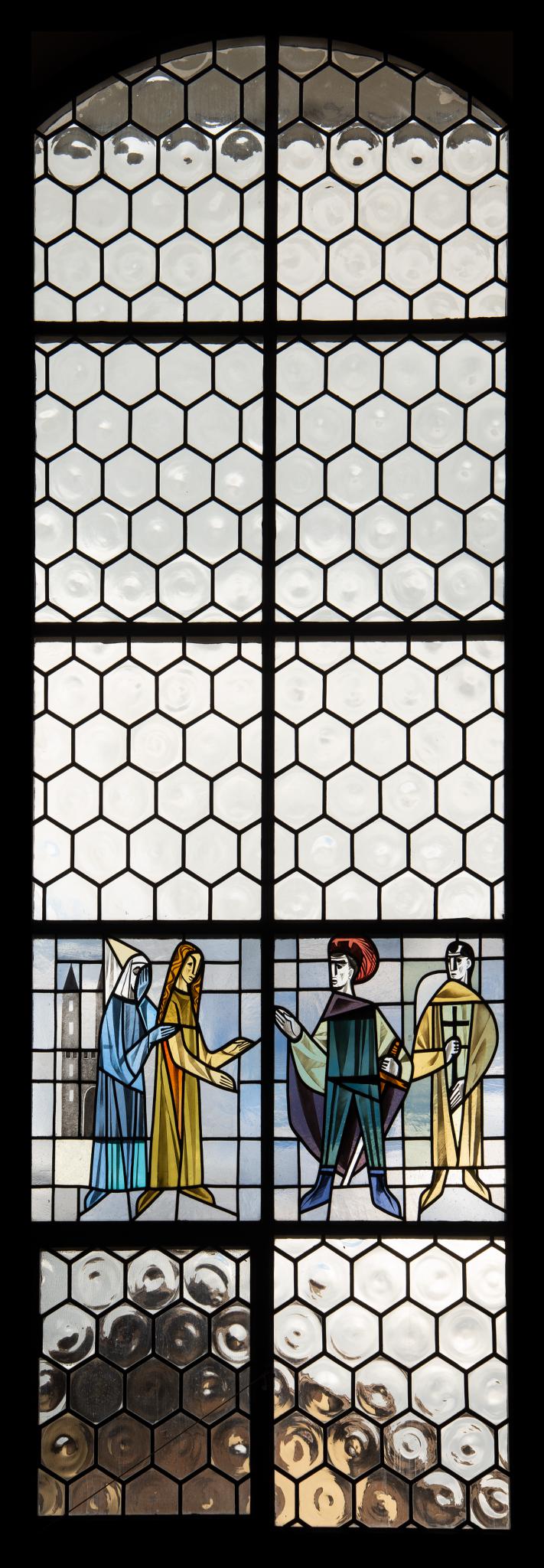Eine Frau und ein Mann, der in seiner linken Hand ein Schwert hält, werden zusammengeführt. Hinter der Frau steht eine andere Frau in mittelalterlicher Gewandung, die sich die Hand vor das Gesicht hält. Dahinter ist eine Burg zu sehen. Hinter dem Mann steht ein Mitglied des Deutschen Ordens.