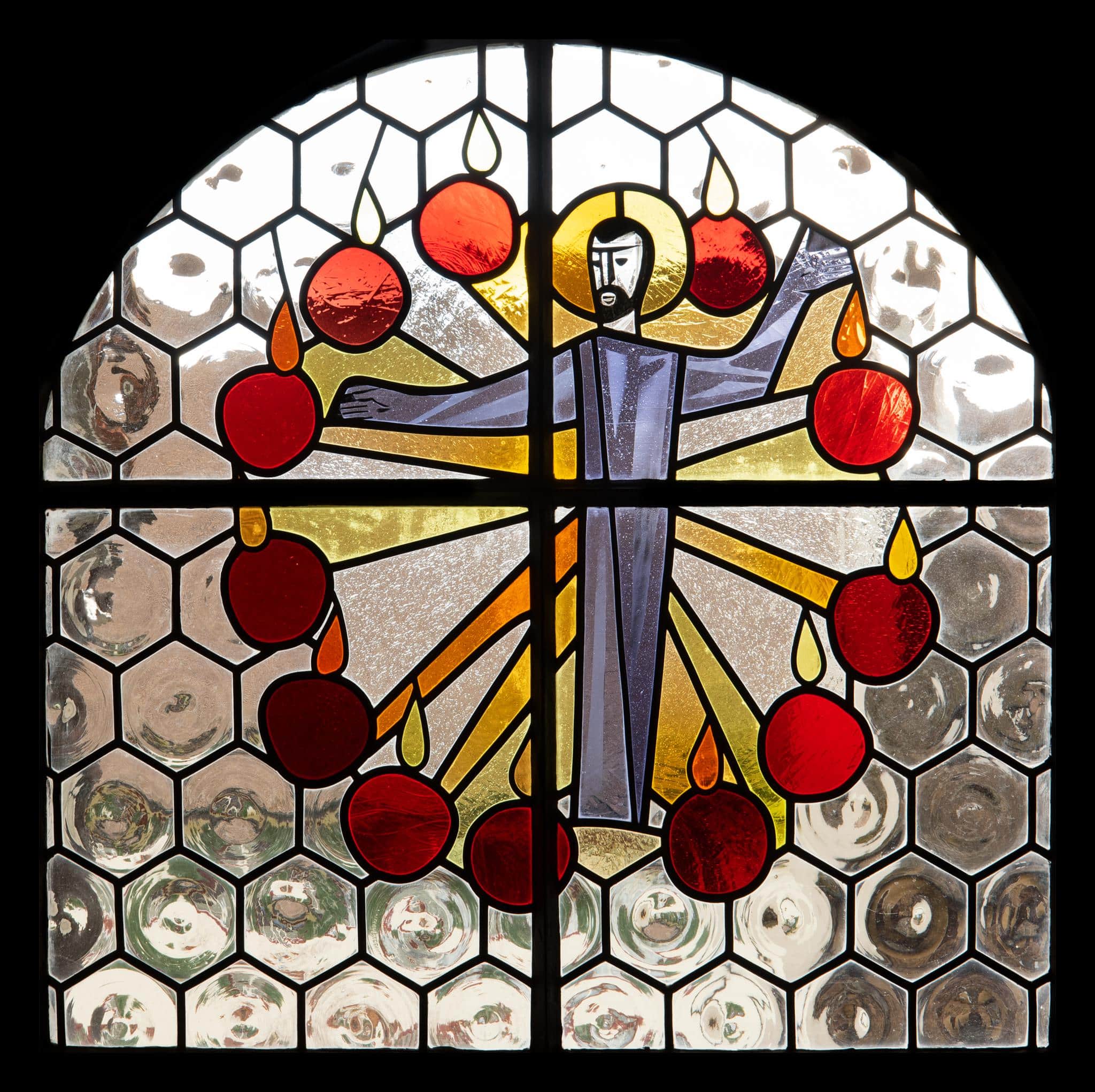 Im Zentrum des wabenverglasten Rundbogenfensters steht Christus. Zwölf rote Kreise mit Flämmchen, welche die Apostel symbolisieren, umgeben ihn. Die Flämmchen verbildlichen die an Pfingsten erfolgte Aussendung des heiligen Geistes.