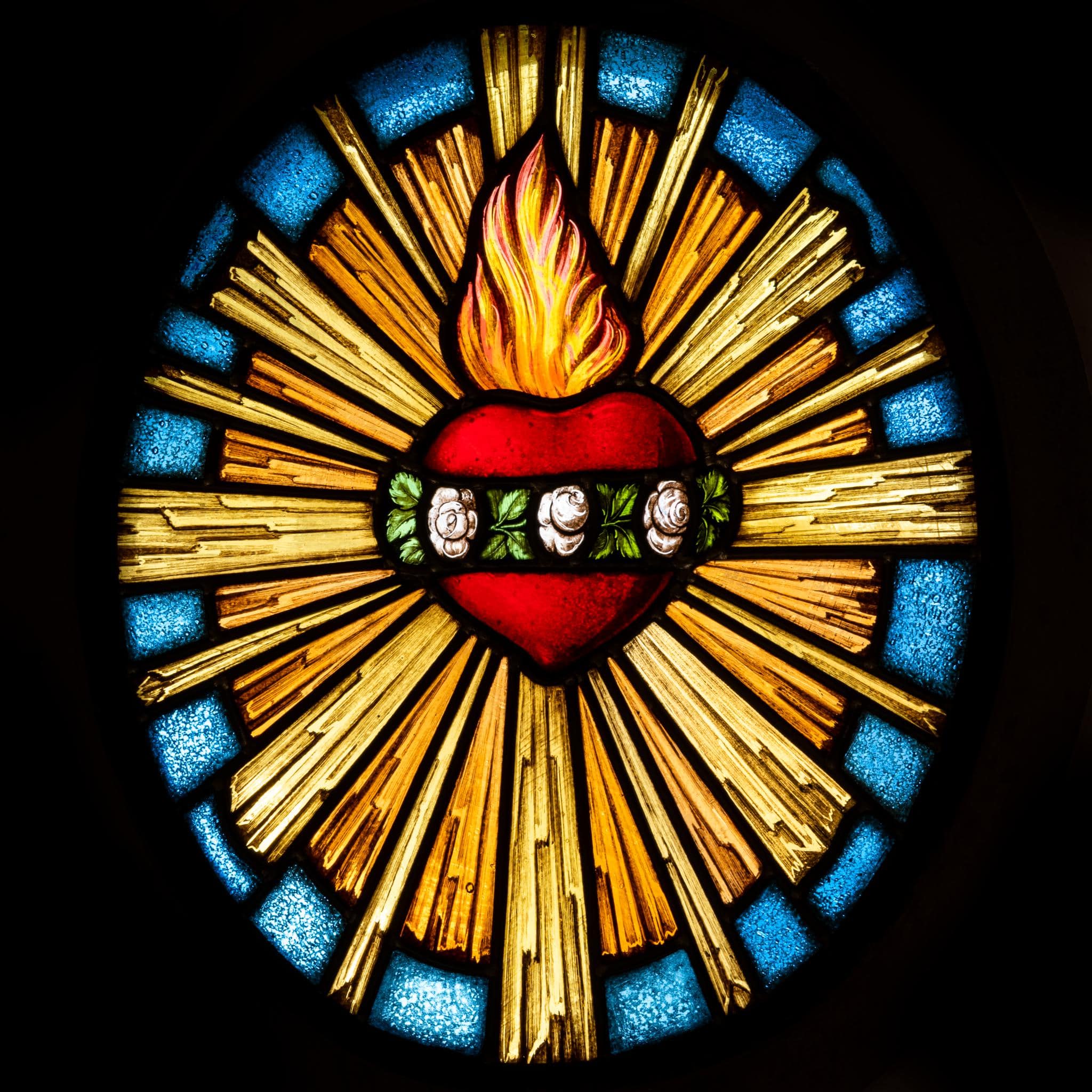Längsovales Fenster mit dem brennenden, mit Rosen umwundenen Herz Marien im Strahlenkranz.