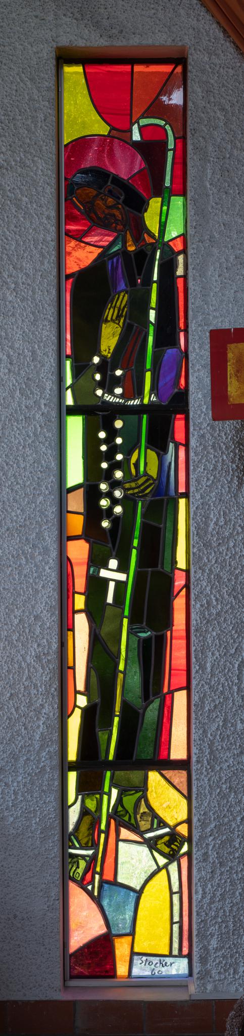 Hochrechteckiges schmales Fenster. Niklaus von Flüe hält in seiner Linken den Pilgerstab, an seinem rechten Arm hängt die Gebetsschnur.