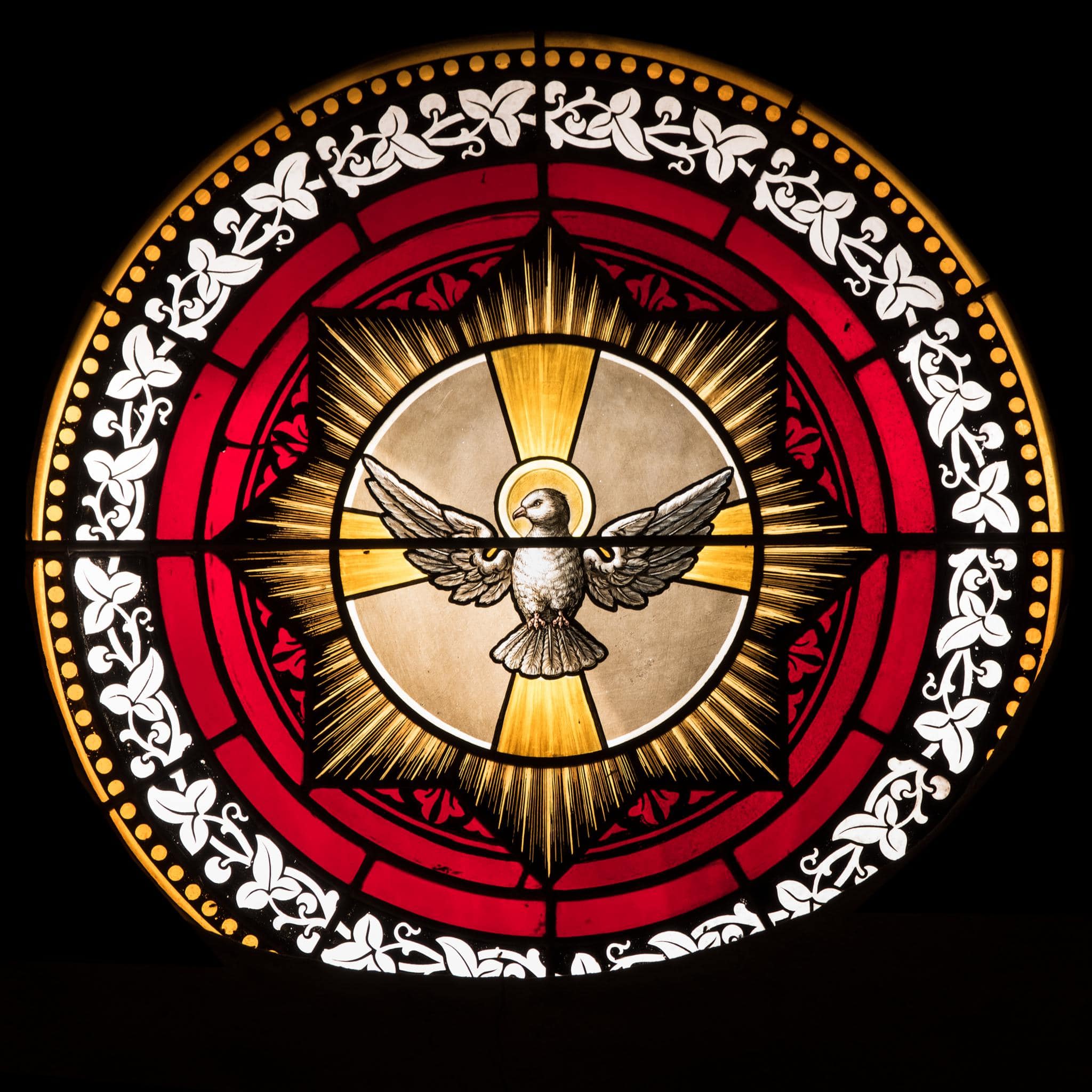 Rundfenster mit der Taube in einem Kreis, umgeben von einem Strahlenkranz in achtzackigem Stern. Randverzierung mit Blattmuster.