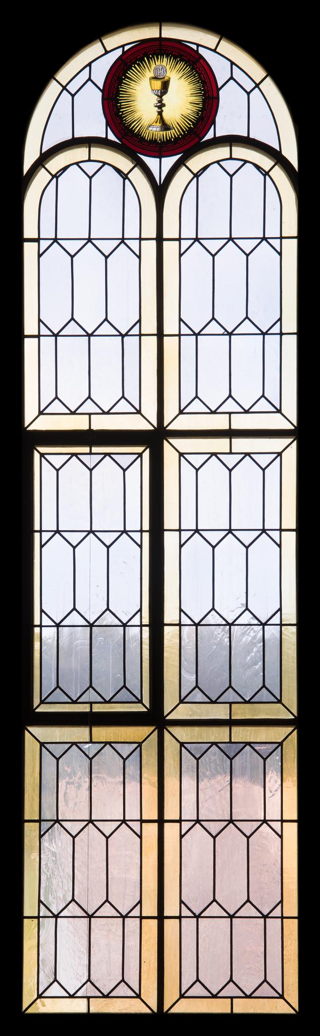 Rot gerahmtes Medaillon mit Kelch und Hostie vor einem Strahlenkranz im Bogenfeld eines Rundbogenfensters mit Blankverglasung (Schweizerrauten) und gelbem Rand.