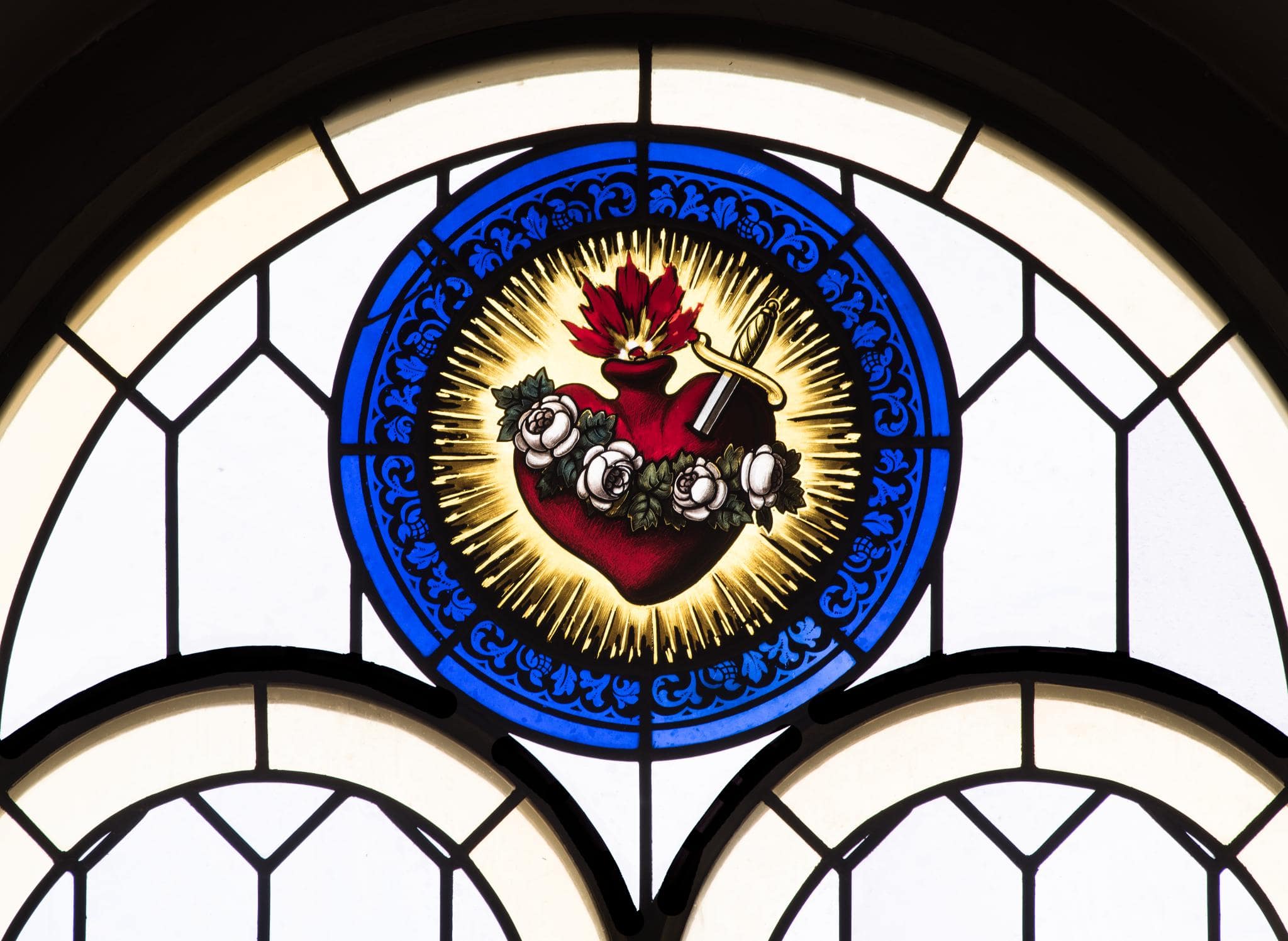 Das Schifffenster ist Teil eines Zyklus, der vom bekannten Glasmaler Johann Jakob Röttinger (1817–1877) geschaffen und 1876 aus Anlass der Neuerrichtung des Kirchenschiffs eingesetzt wurde (Scheiwiller-Lorber, 2014, S. 324). In den drei Rundfenstern im Chor sowie in den Bogenausmündungen der acht Schifffenster, die ansonsten wie die Chor- und Emporenfenster eine einfache, gelb eingefasste Rautenverglasung aufweisen, sind Medaillons mit farbig gestalteten christlichen “Monogrammen” (Symbole, Bilder und Buchstabenfolgen) untergebracht. Mit Schwarzlot bemalt und hauptsächlich in den Farben blau, rot und gelb gehalten, zeichnen sich die Medaillons in Herdern durch kräftige Farbkontraste aus. Als “Chiffren” der Heilsgeschichte wurden solche Monogramme im dritten Viertel des 19. Jahrhunderts oft in katholischen Kirchen angebracht und häufig in ähnlicher Art ausgeführt. Ein Grund dafür liegt darin, dass es sich um eine kostengünstige Variante der Fenstergestaltung handelte. Vergleichbare Glasmalereien von Röttinger befinden sich bspw. in der katholischen Pfarrkirche von Alterswil FR (Scheiwiller-Lorber, 2014, S. 168-172). Womöglich handelt es sich bei den Glasfenstern der katholischen Kirche St. Sebastian um das letzte Werk Johann Jakob Röttingers.