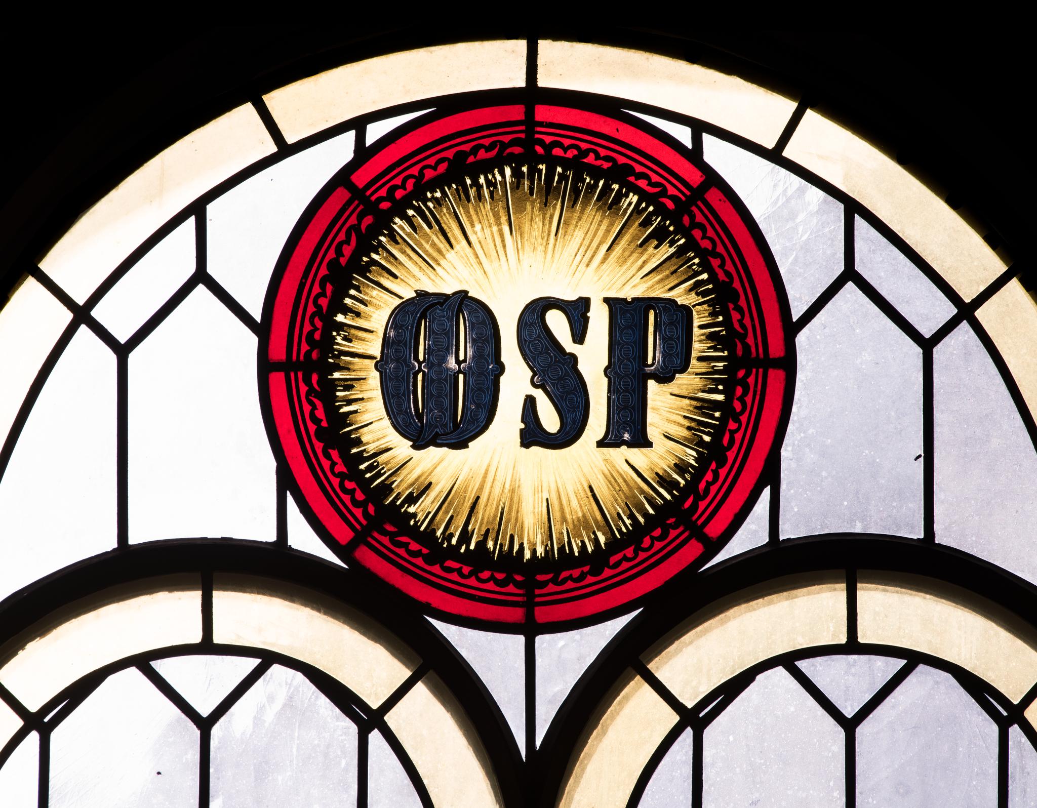 Rot gerahmtes Medaillon mit dem Monogramm Josephs vor einem Strahlenkranz im Bogenfeld eines Rundbogenfensters mit Blankverglasung (Schweizerrauten) und gelbem Rand.