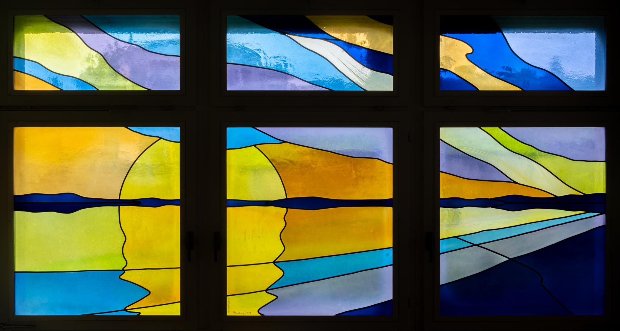 Das sechsteilige Fenster zeigt eine untergehende Sonne in Gelb- und Blautönen.