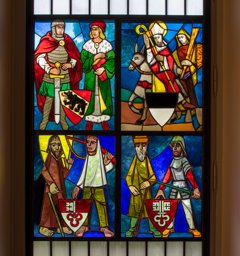 Der Zähringer Herzog Berchtold V. (†1218), Gründer der Stadt Bern auf der linken Seite und Konrad Justinger (†1438), Stadtschreiber und Chronist, zur rechten Seite stehen als Schildhalter hinter dem Wappen Berns.
