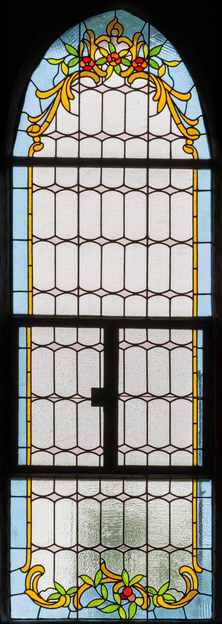 Vierteiliges Spitzbogenfenster mit gelber Rahmung aus stilisierten Rocaillen mit floralem Ornament im Bogenfeld. Bordüre aus hellblau getöntem Glas, Fensterfläche aus weissem Glas (abgerundete Rauten, zudem kleine Spickel aus lila gefärbtem Glas). Identisch mit s II.