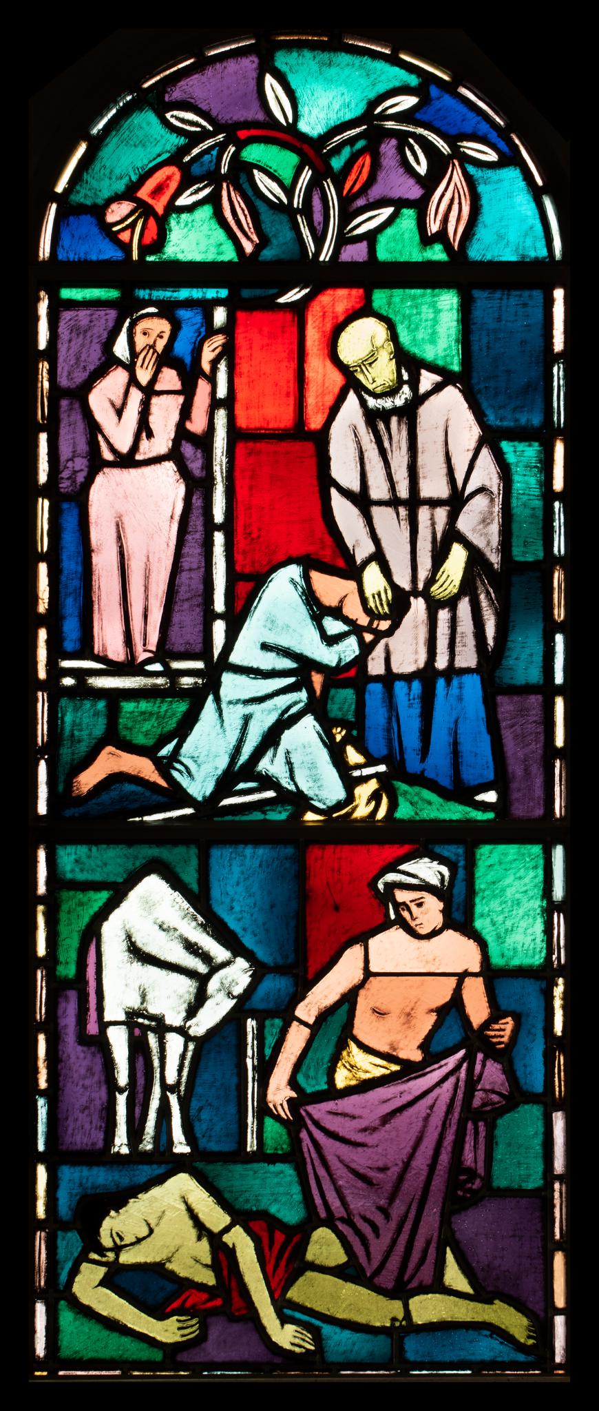 Im oberen Bildregister kniet der zurückgekehrte verlorene Sohn vor seinem Vater, die Mutter steht dahinter im Türrahmen. Im unteren Bildregister deckt der Barmherzige Samariter den Verletzten zu, im Hintergrund ist das Reittier zu erblicken. Eine schmale Bordüre aus hellen Gläsern rahmt die vor einen Hintergrund aus farbigen Vierecken gesetzten Szenen. Das Bogenfeld schmücken zwei Blumen.
