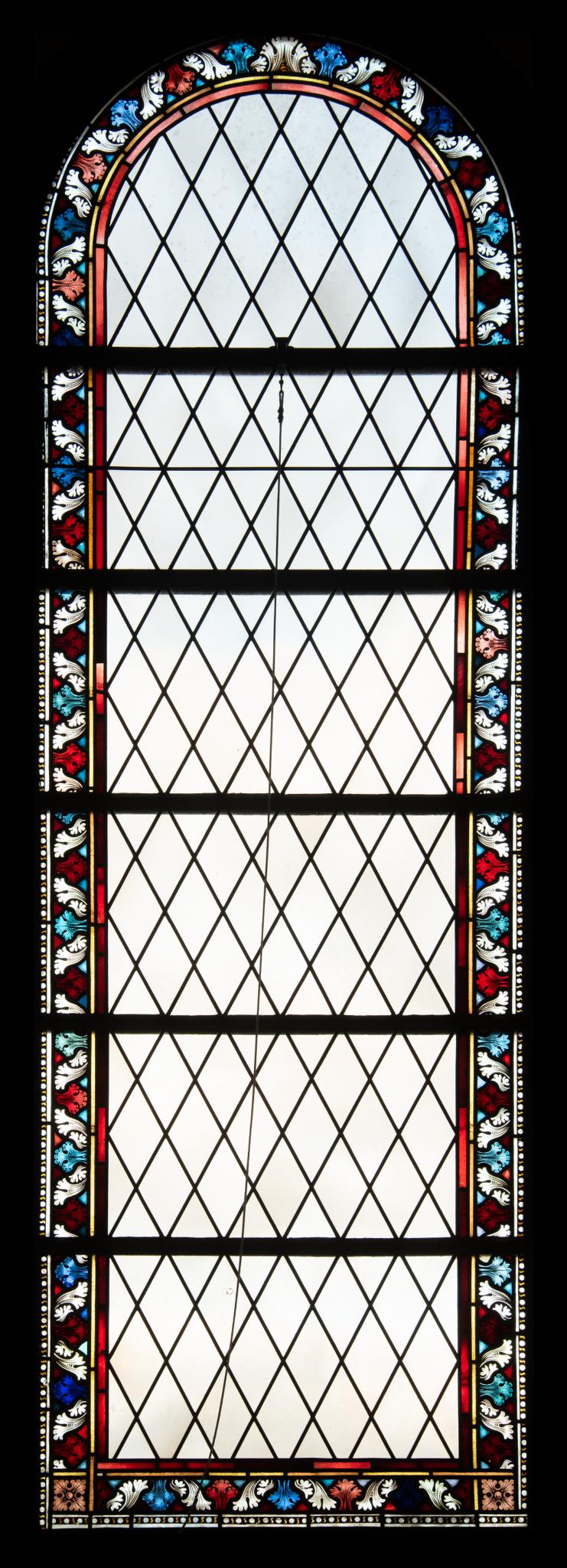 Sechsteiliges Rundbogenfenster mit Rautenverglasung und Zierrahmen mit stilisiertem Pflanzenfries.