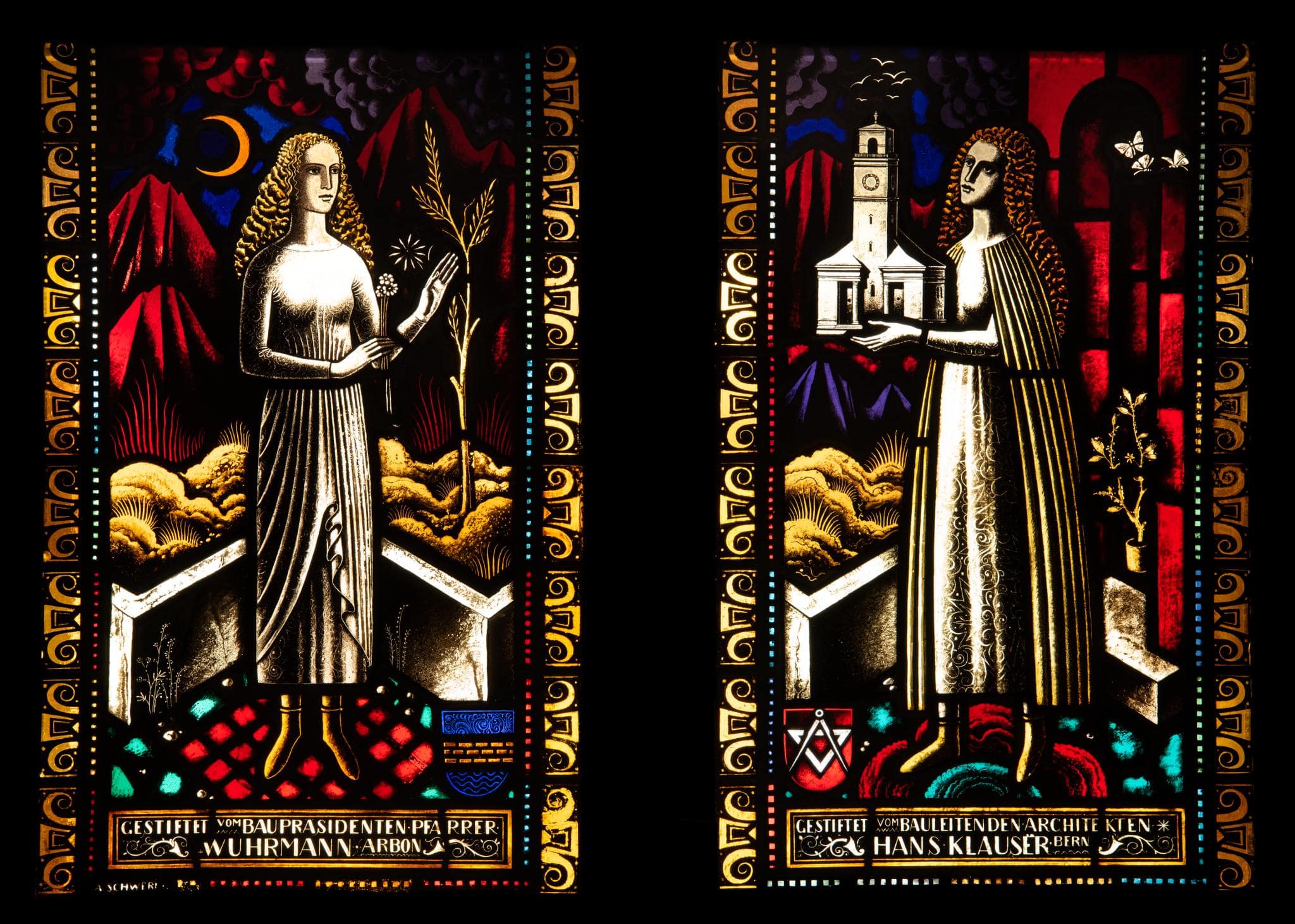 Anlässlich des Neubaus der evangelischen Kirche von Arbon stifteten der Baupräsident und Pfarrer Willy Wuhrmann sowie der Architekt Hans Klauser je eine Wappenscheibe in den Chornebenraum. Sie sind signiert vom Berner Glasmaler Albin Schweri, der auch das grosse Christusfenster für den Chor entwarf. Schweri erhielt, ausser der Zahlung für das Christusfenster, im Jahr 1927 den Betrag von 264 Franken ausbezahlt (evang. Kirchgemeindearchiv Arbon, Rechnungen, 25. Okt. 1927). Wahrscheinlich bezieht sich diese Zahlung auf die beiden Wappenscheiben.