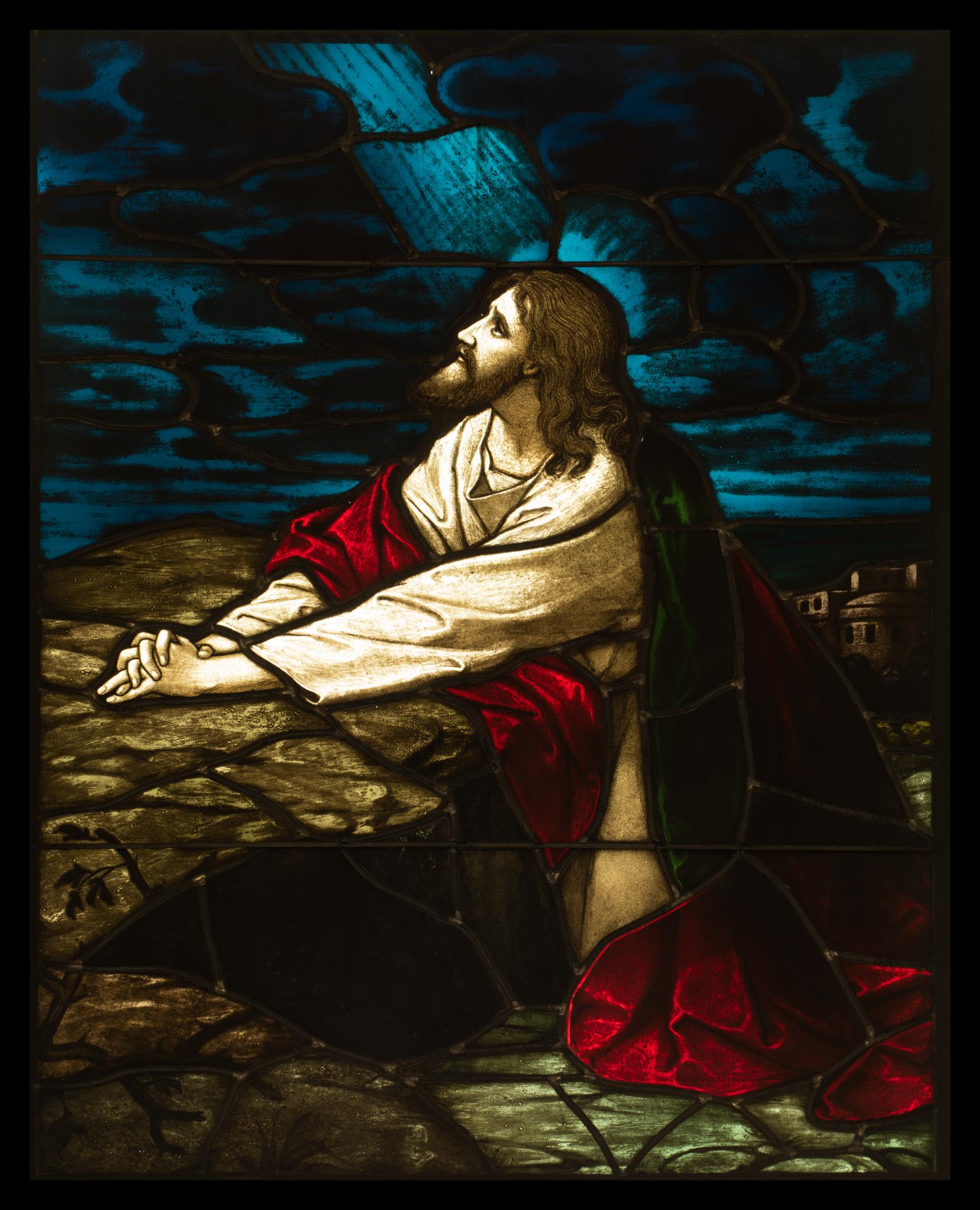 Blankverglastes zehnteiliges Segmentbogenfenster mit Glasmalerei im zweiten Register. Die Glasmalerei zeigt das Gebet Christi auf dem Ölberg. Jesus Christus betet kurz vor seiner Gefangennahme in grosser Angst zu Gott.