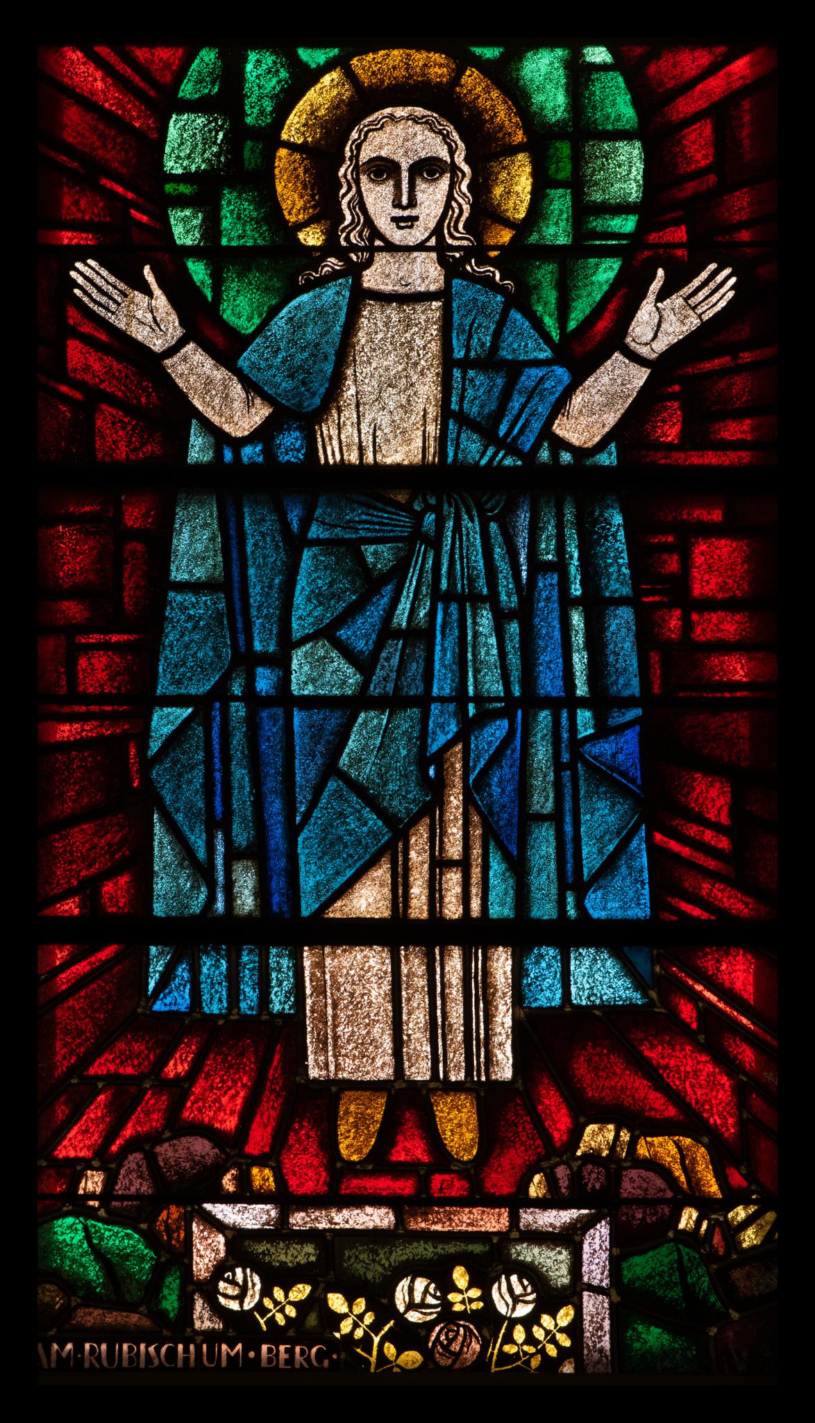 Hochrechteckiges, schmales Fenster mit farbigen Rechtecken und Rahmenverzierung. Im unteren Drittel Darstellung der Himmelfahrt Mariae. Maria schwebt mit ausgebreiteten Armen über ihrem Grab, aus dem Rosen spriessen.