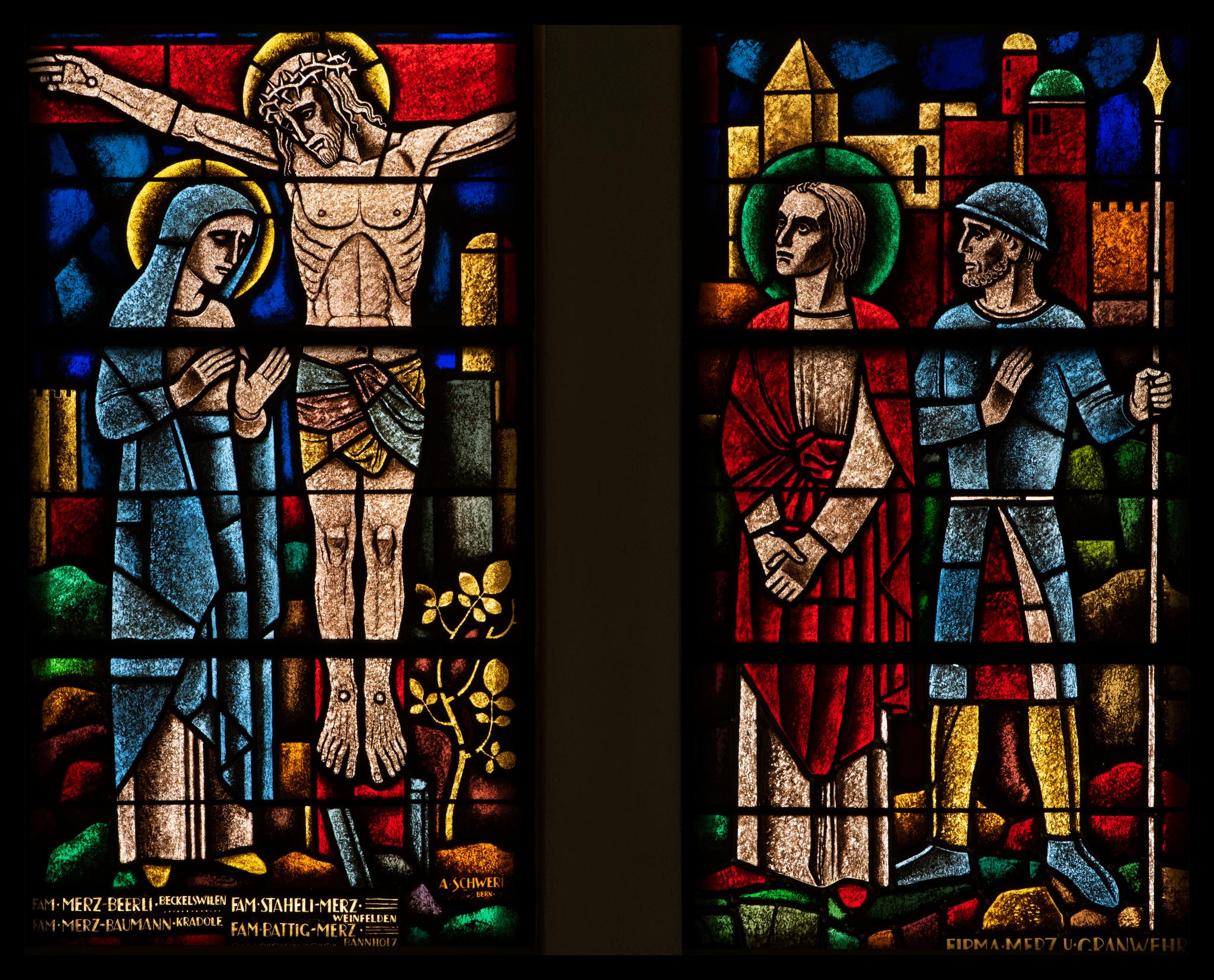 Stilistisch sind die Glasmalereien mit denjenigen, die Albin Schweri für die katholische Pfarrkirche in Lungern OW (1930−1933), für die christkatholische Kirche St. Peter und Paul (1935) und die Dreifaltigkeitskirche in Bern (1936−1939) schuf, vergleichbar.