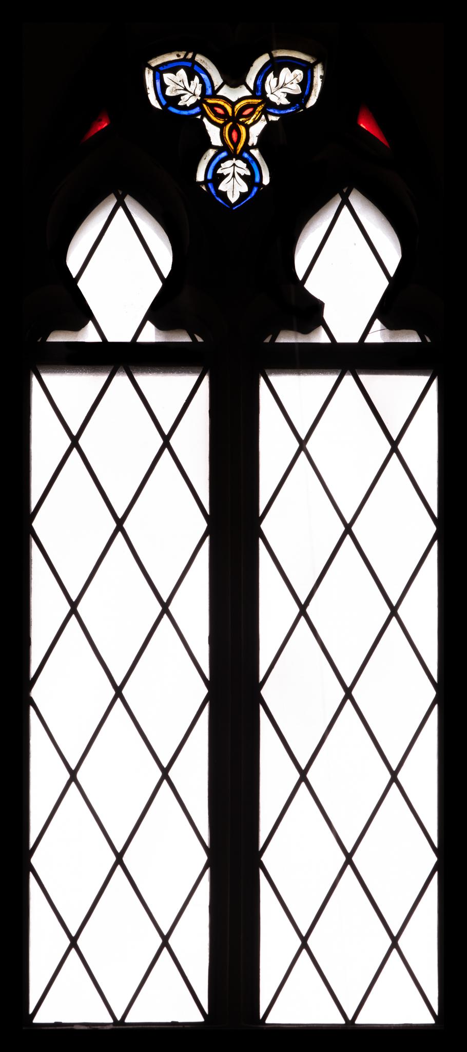 Zweilanzettiges Masswerkfenster mit blanker Rautenverglasung, im farbig gestalteten Couronnement (Dreipass) stilisierte Blätter. Identisch mit gegenüberliegendem Fenster S IV.