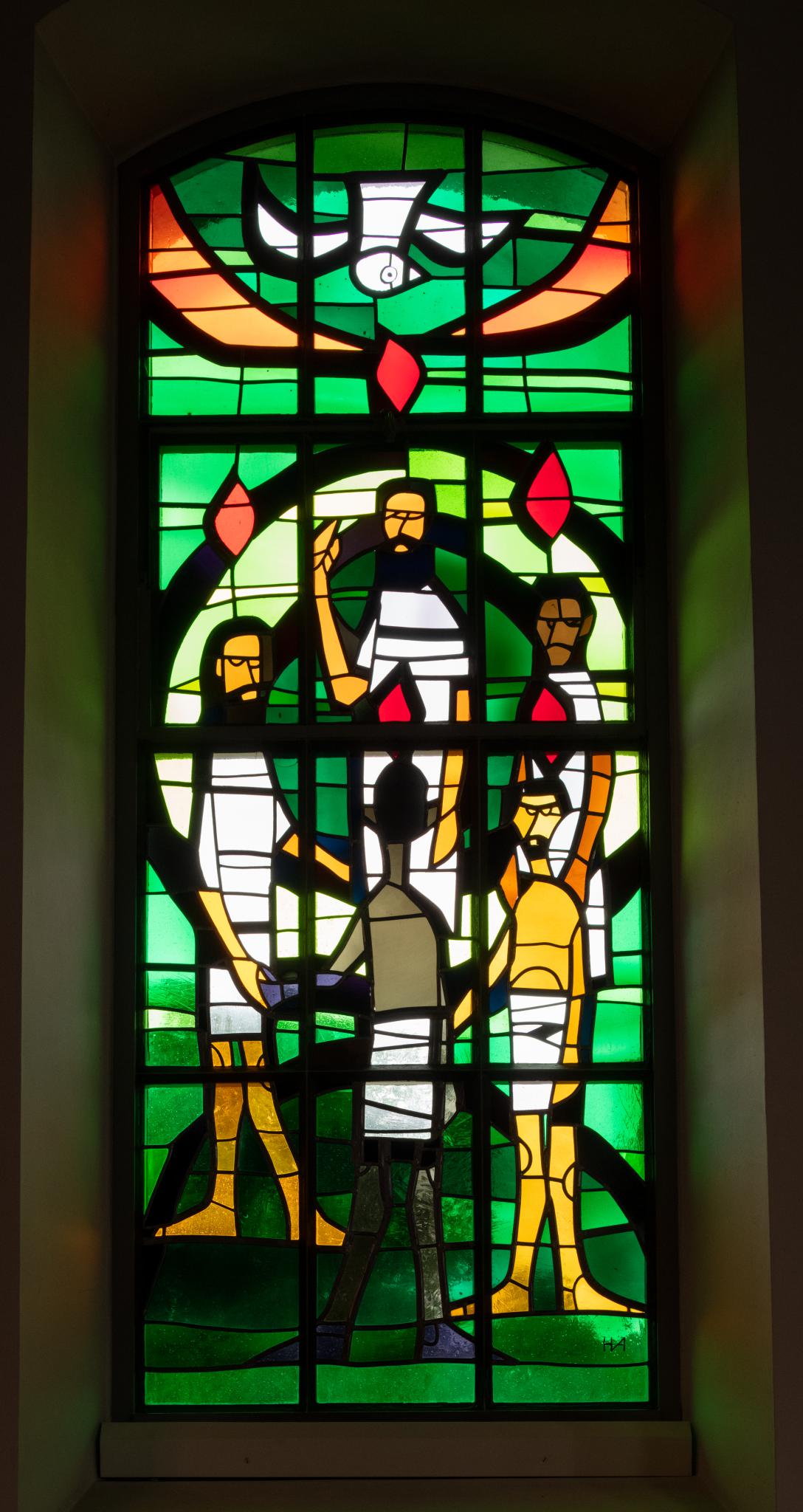 Flachbogenfenster in Grüntönen. Die Apostel empfangen den Heiligen Geist, der zuoberst als Taube erscheint. Als dessen Zeichen schweben Flämmchen über den Köpfen der Apostel.