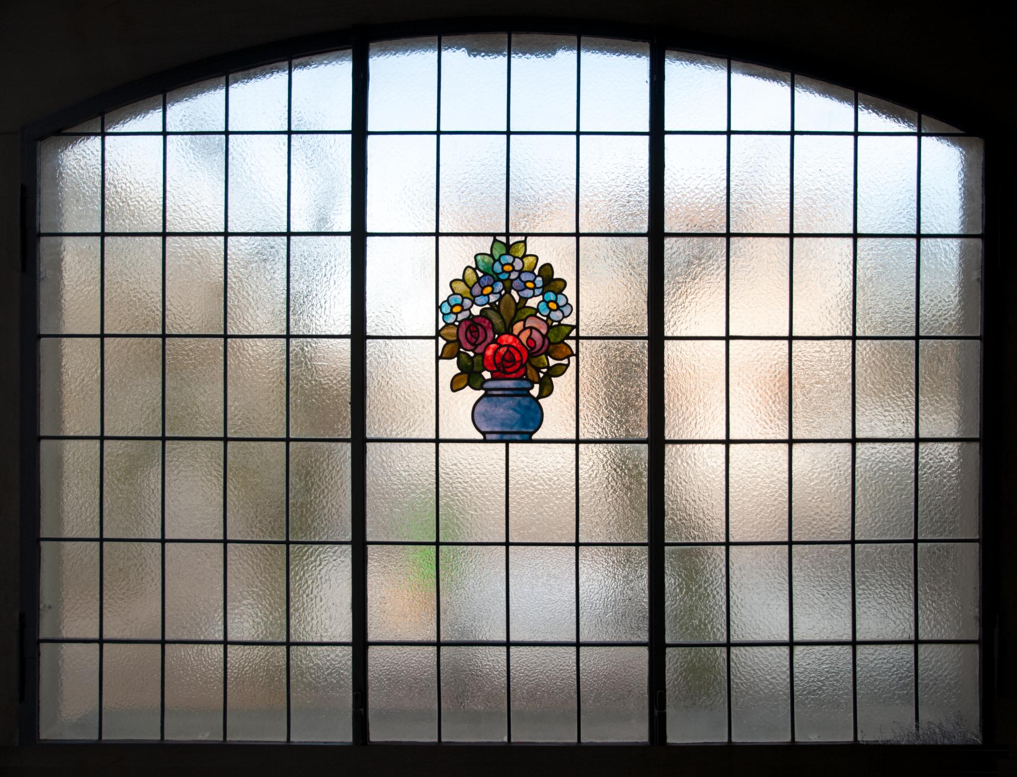 Dreiteiliges Segmentbogenfenster mit der stilisierten Darstellung eines Blumenbouquets im mittleren Teil. Übrige Fensterflächen blankverglast (Rechtecke).