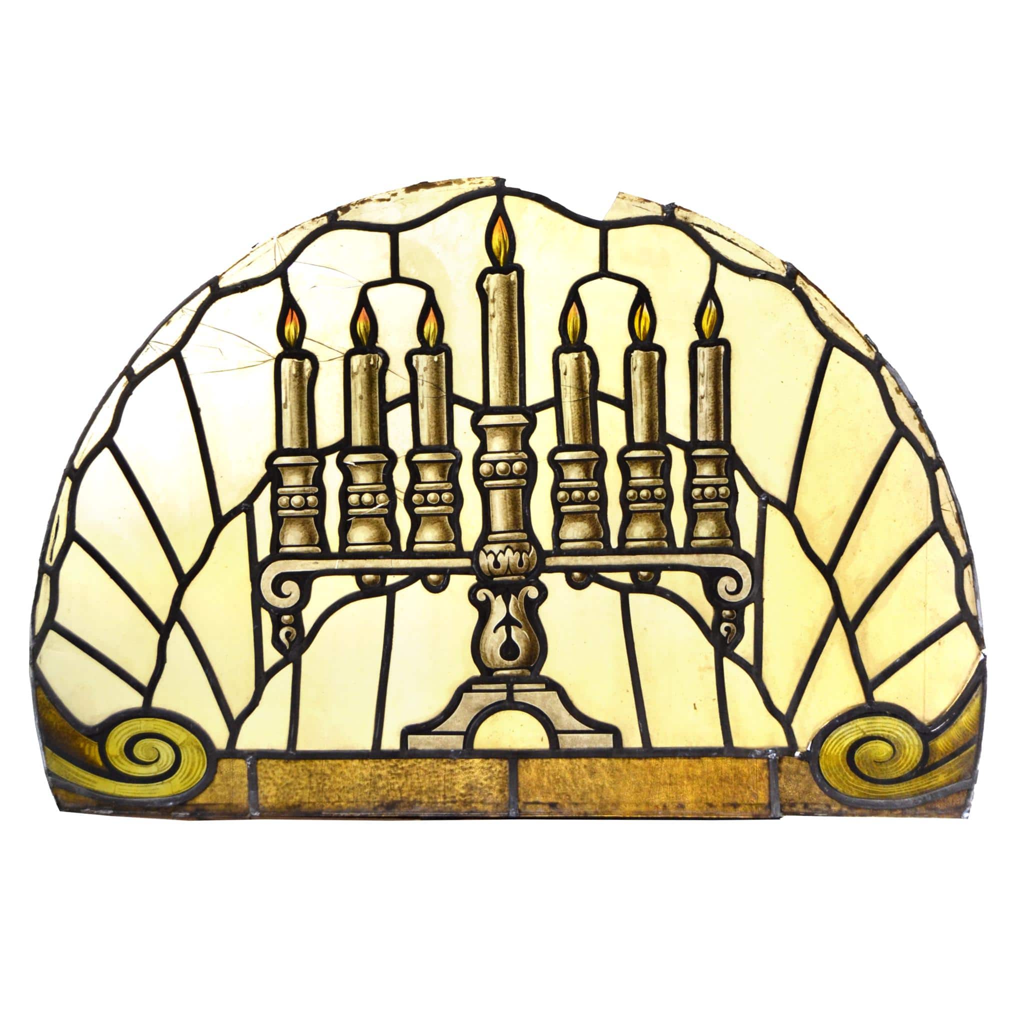 Fragment einer nierenförmigen Fensterverglasung, in deren Zentrum ein siebenarmiger Leuchter dargestellt war. Ein breiter Schmuckrahmen umfasste ursprünglich das ansonsten wohl blank verglaste Fenster. Erhalten ist einzig das Feld mit dem christlichen Symbol.