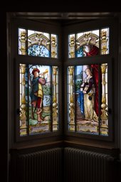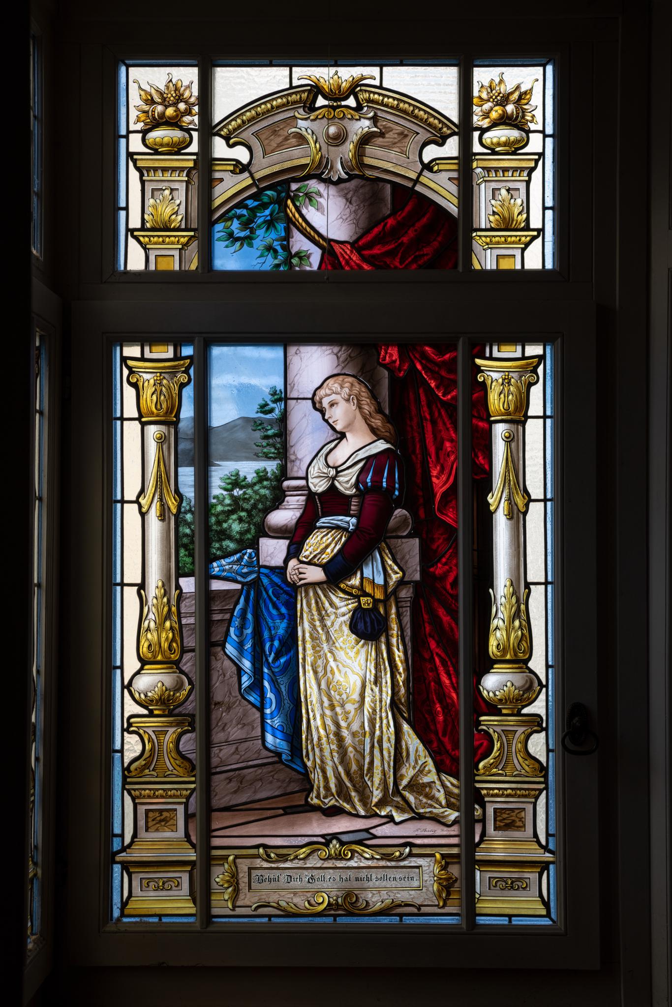 Im Erker des Obergeschosses ist auf zwei Glasgemälden eine romantische Szene aus dem 1853 von Joseph Victor von Scheffel verfassten Versepos “Der Trompeter von Säckingen” dargestellt. Der Bürgersohn Werner steht am Rhein und spielt der adeligen Margaretha das Ständchen “Behüt Dich Gott” zum Abschied, nachdem deren Vater einer Heirat der beiden Liebenden nicht zugestimmt hatte (TG_2439). Margaretha steht ihrerseits den Klängen lauschend auf dem Balkon des Schlosses über dem Rhein (TG_2440). Zur Eheschliessung wird es erst später, nach einem zufälligen Wiedersehen in Italien und Werners Ernennung zum Ritter kommen. Von Scheffel liess sich von einer wahren Begebenheit des 17. Jahrhunderts zum Text inspirieren: von der nicht standesgemässen Ehe des Säckinger Bürgersohns Franz Werner Kirchhofer (1633–1690) mit der adeligen Maria Ursula von Schönau. Das Versepos erfreute sich im 19. Jahrhundert grosser Beliebtheit. Bronzefiguren des “Trompeters” wurden in zahlreichen bürgerlichen Wohnhäusern aufgestellt und mit dem Aufschwung der profanen Glasmalerei um 1900 fand das Thema Eingang in ein weiteres Bildmedium. Architektonische Rahmungen wie die der beiden Glasmalereien im Erker des Wohnhauses in Weinfelden sind sonst für kleinere Wappenscheiben üblich, Berbig übertrug sie jedoch mehrmals auch auf grosse Fenster (siehe bspw. TG_2105).