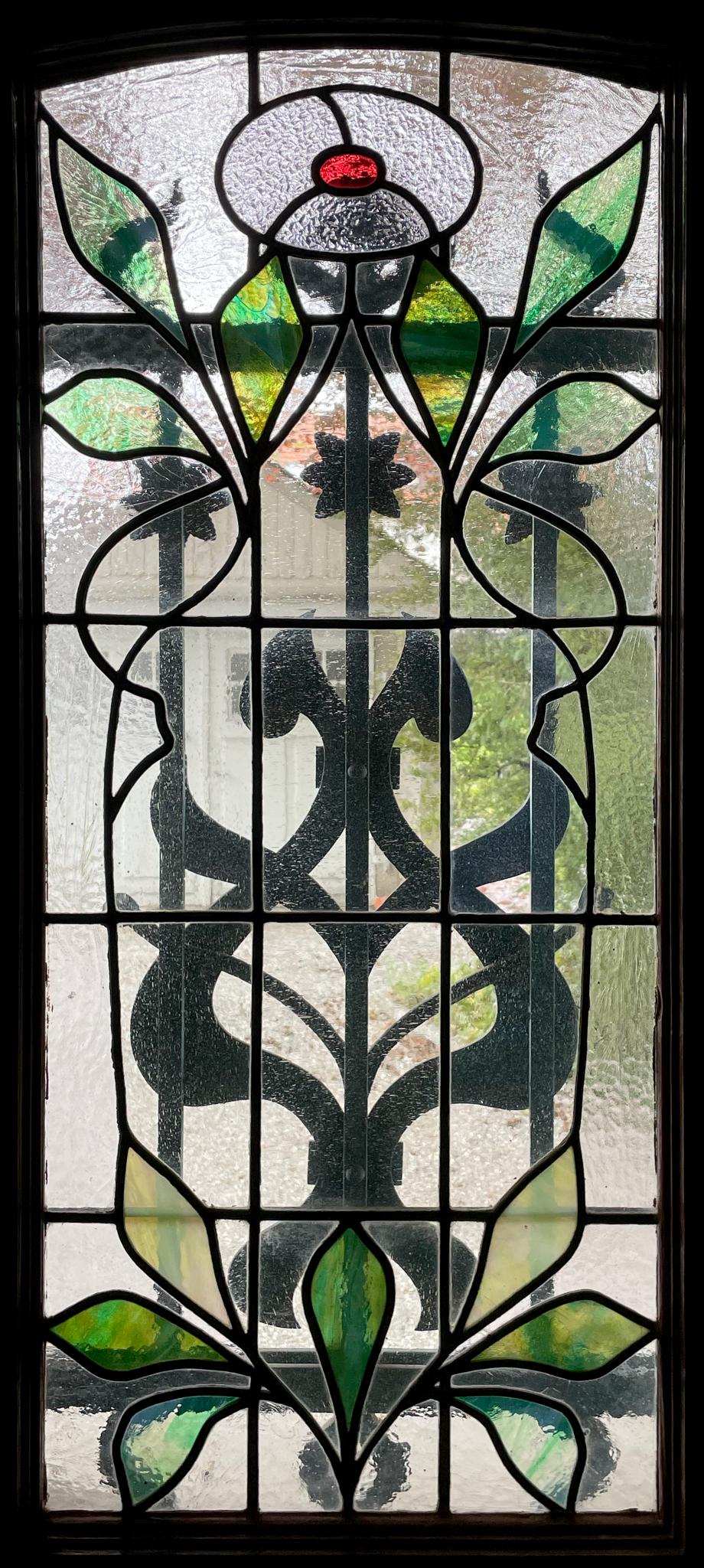 Segmentbogenfenster mit stilisierten weissen Blumen im Jugendstil.