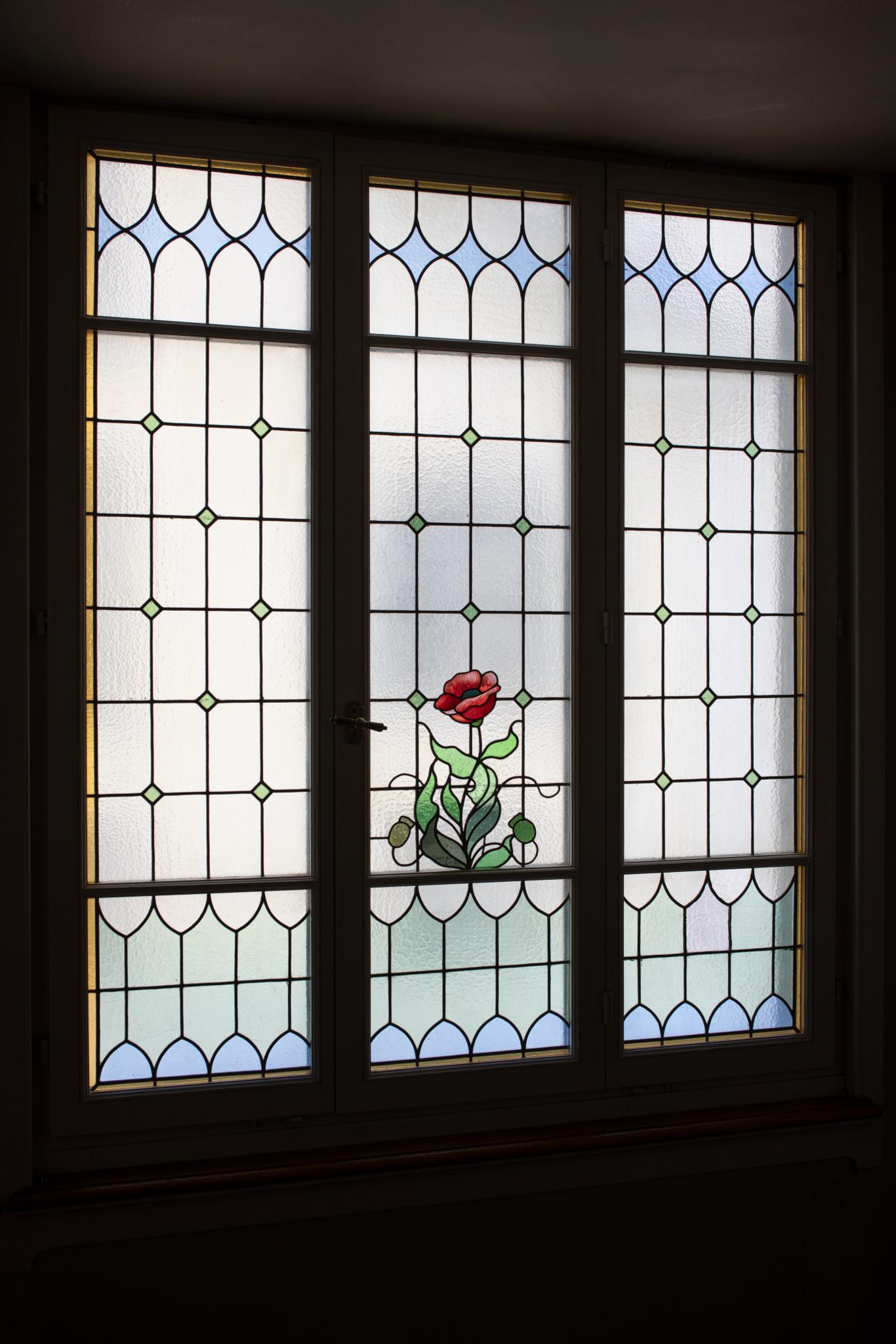 Dreiteiliges rechteckiges Fenster mit ornamentaler Verbleiung und Mohnpflanze im Zentrum. Bildet eine Einheit mit dem darüberliegenden Treppenhausfenster (TG_2471).