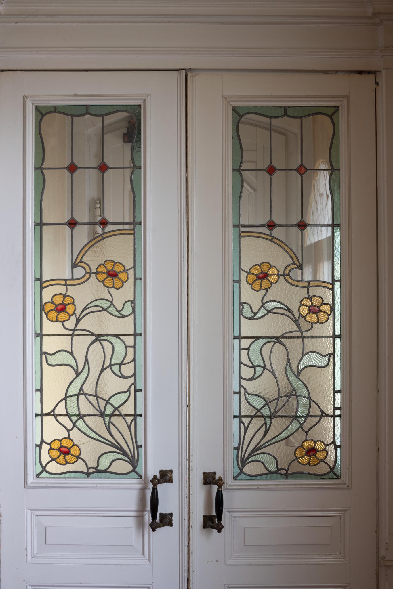 Hochrechteckige symmetrische Verglasung von zwei Türflügeln mit einem bewegten Pflanzenmotiv im unteren Bereich (grüne Blätter und gelbe Blüten).