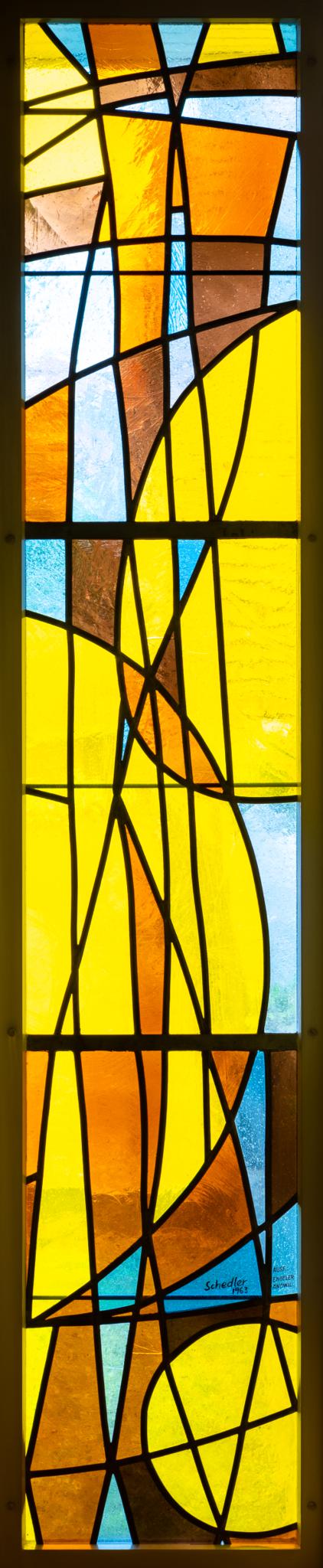 Hochrechteckfenster mit abstrakt-geometrischer Glasmalerei. Dominierende Gelbtöne.