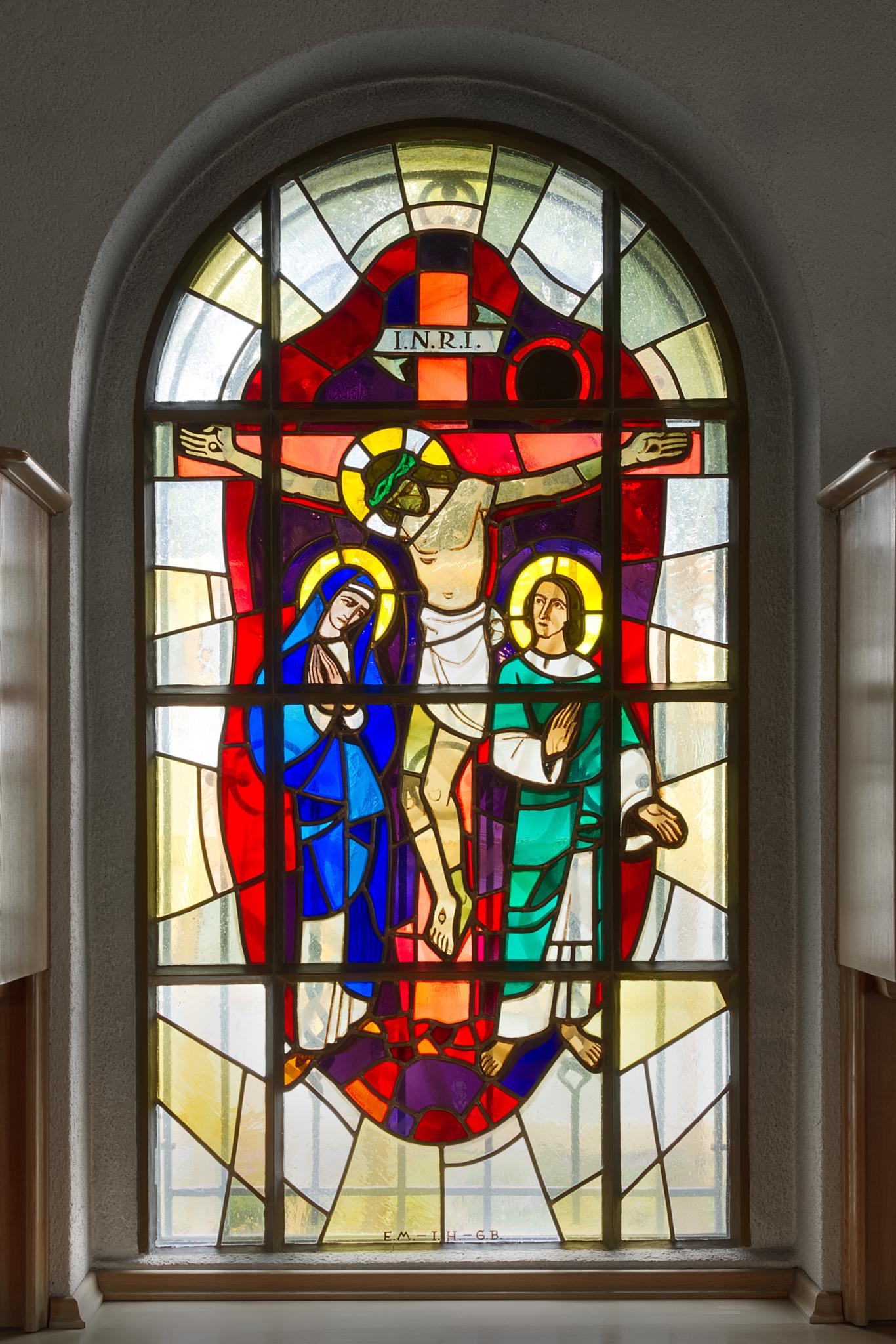 Vor einem rotblauen, ondulierenden Oval erscheint der gekreuzigte Christus. Neben ihm stehen links Maria und rechts Johannes, der zu ihm aufblickt.