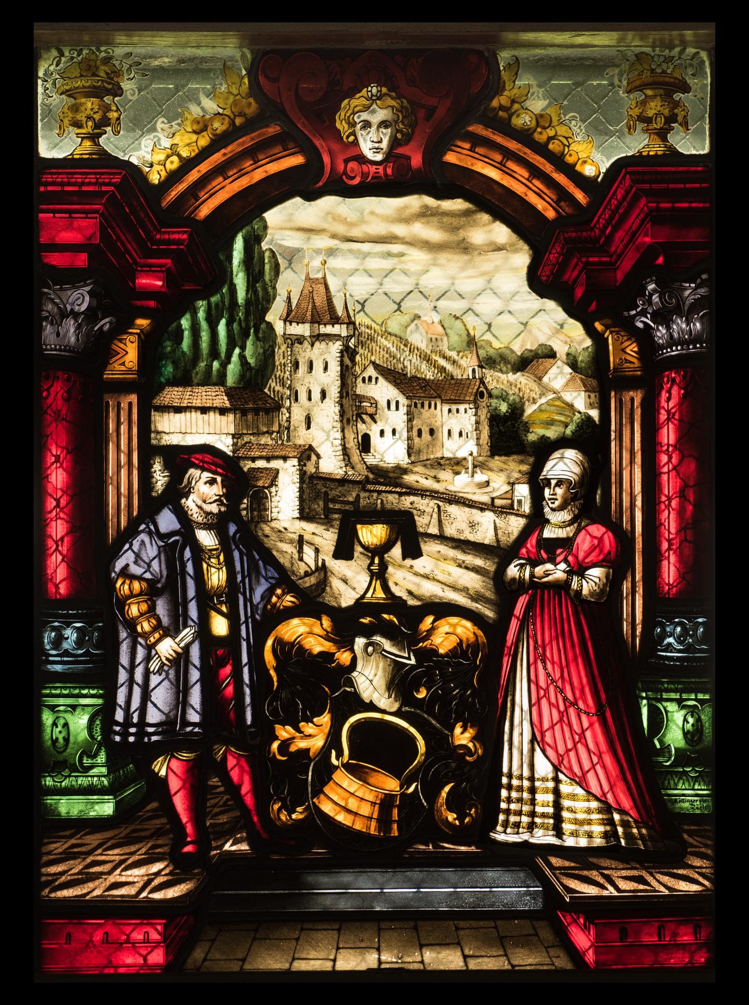 Im Vordergrund stehen auf Fliesenboden ein Truchsess und seine Frau als Schildhalter des Vollwappens der Truchsessen von Ittingen. Dahinter ist die 1079 anlässlich ihrer Zerstörung erstmals erwähnte und nachher wieder aufgebaute Burg Ittingen in einer phantasievollen Ansicht dargestellt. Neben dem befestigten Burgtor ragt ein Torbau mit einem hölzernen Obergaden auf, dahinter der mächtige Bergfried mit hohem Dach und zahlreichen Türmchen. Durch eine gedeckte Holzbrücke ist mit ihm der winkelförmige Palas verbunden. Hinter den Rebbergen ist anachronistisch schon die erst 1471–1474 erbaute Kapelle von Warth zu sehen (vgl. Früh, 1993, S. 126). Zwei Pfeiler mit vorgelagerten Säulen tragen einen Rundbogen, dessen Scheitelkartusche eine Maske trägt.