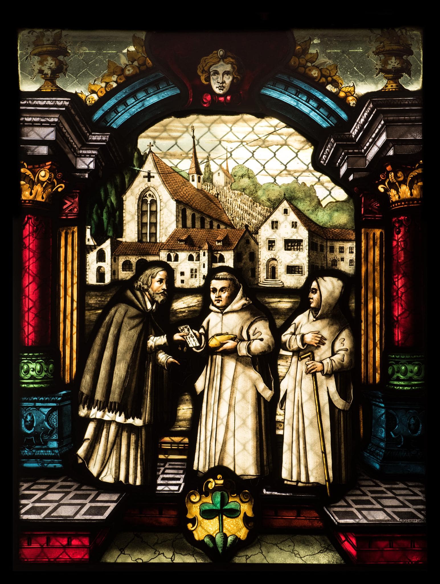 Der letzte Propst des Augustinerchorherrenstifts Wilhelm Neidhart verkauft im Jahr 1461 das verarmte Kloster an zwei Kartäuser. Er überreicht dem einen, der mit einem Geldbeutel dasteht, den gesiegelten Kaufbrief, der andere Mönch hält einen Wanderstab. Im Hintergrund ist das Kloster zu sehen. Links ist die Kirche dargestellt, in der Mitte der Westflügel der Klosteranlage und rechts der zweiflüglige, abgewinkelte Klosterbau. Pfeiler mit vorgelagerten Säulen tragen einen Rundbogen, dessen Scheitelkartusche eine Maske trägt. Am Scheibenfuss ist das Wappen des Augustinerprobsts angebracht.