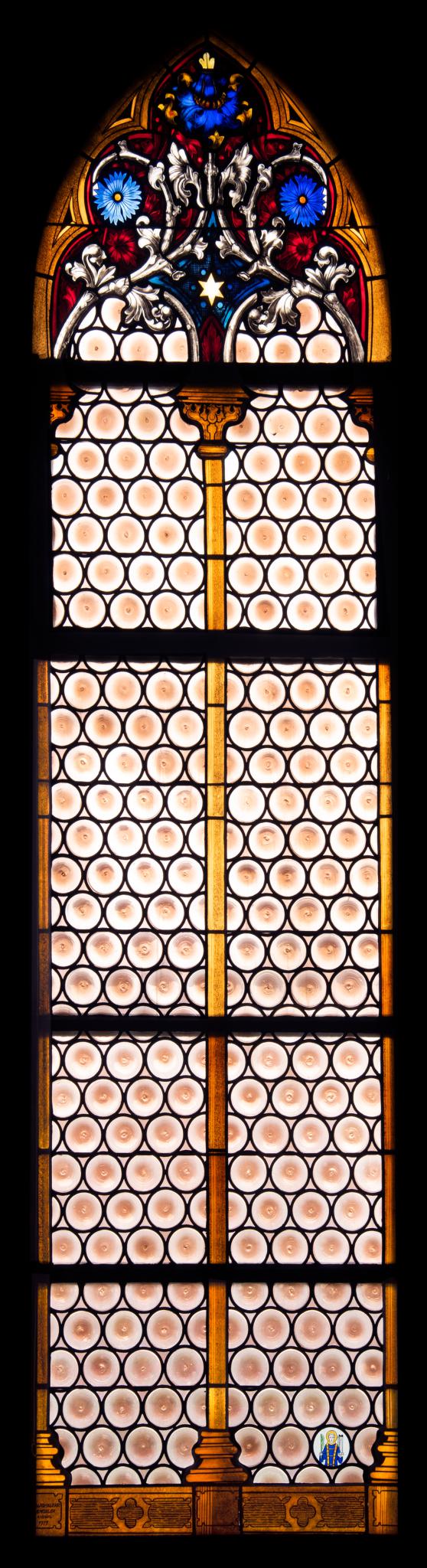 Eines von acht neugotischen Schifffenstern, die um 1906 in Anlehnung an die älteren Fenster Eduard Hechts von 1881 (siehe TG_334 – TG_337) geschaffen wurden.