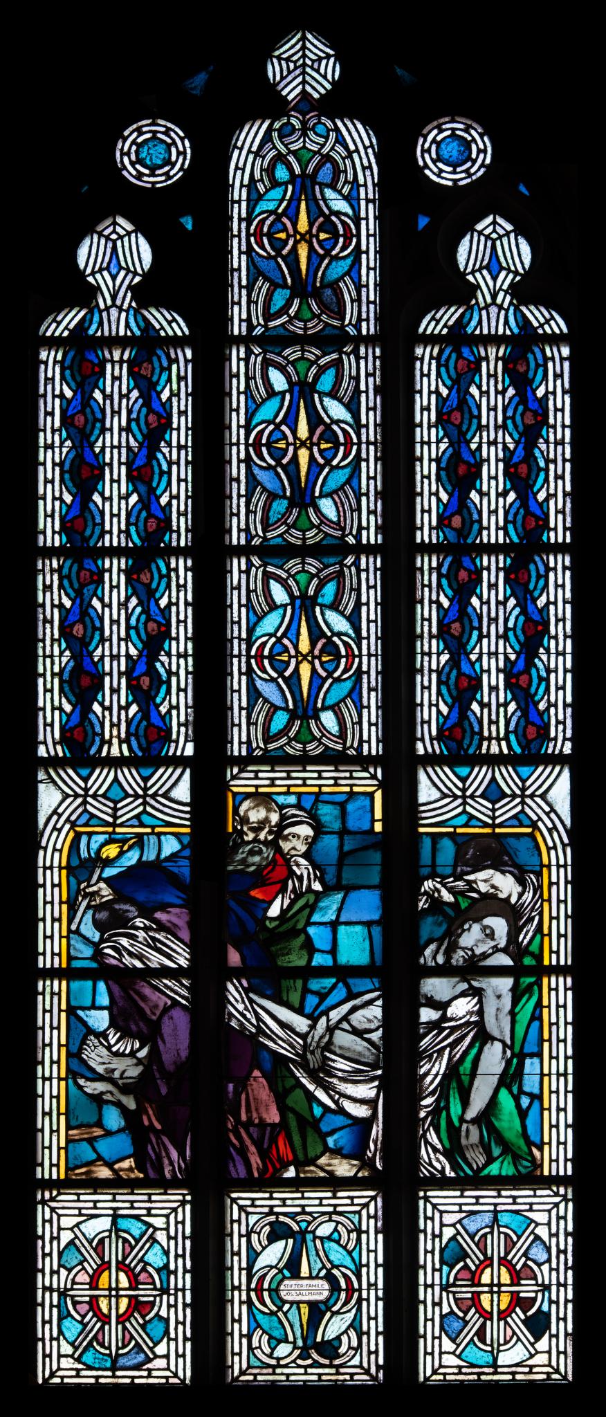 Monumentales, dreilanzettiges Masswerkfenster mit der Darstellung der Grablegung Christi in sechs Feldern der unteren Fensterhälfte. Der Leib Jesu wird in einem weissen Tuch von zwei Personen in grünen und violetten Gewändern getragen. Dahinter sind Josef von Arimathäa mit einer Kerze und eine Frau mit von Schmerz gezeichnetem Gesicht gezeigt. Die Bildszene ist von einem Ornamentrahmen in Gelb und Weiss gefasst. In der ornamentierten Sockelzone erscheint der Stiftername, die Zone oberhalb der bildlichen Darstellung und das Masswerk sind mit kleinteiligen, geometrischen Ornamenten in Blau- und Grüntönen geschmückt.