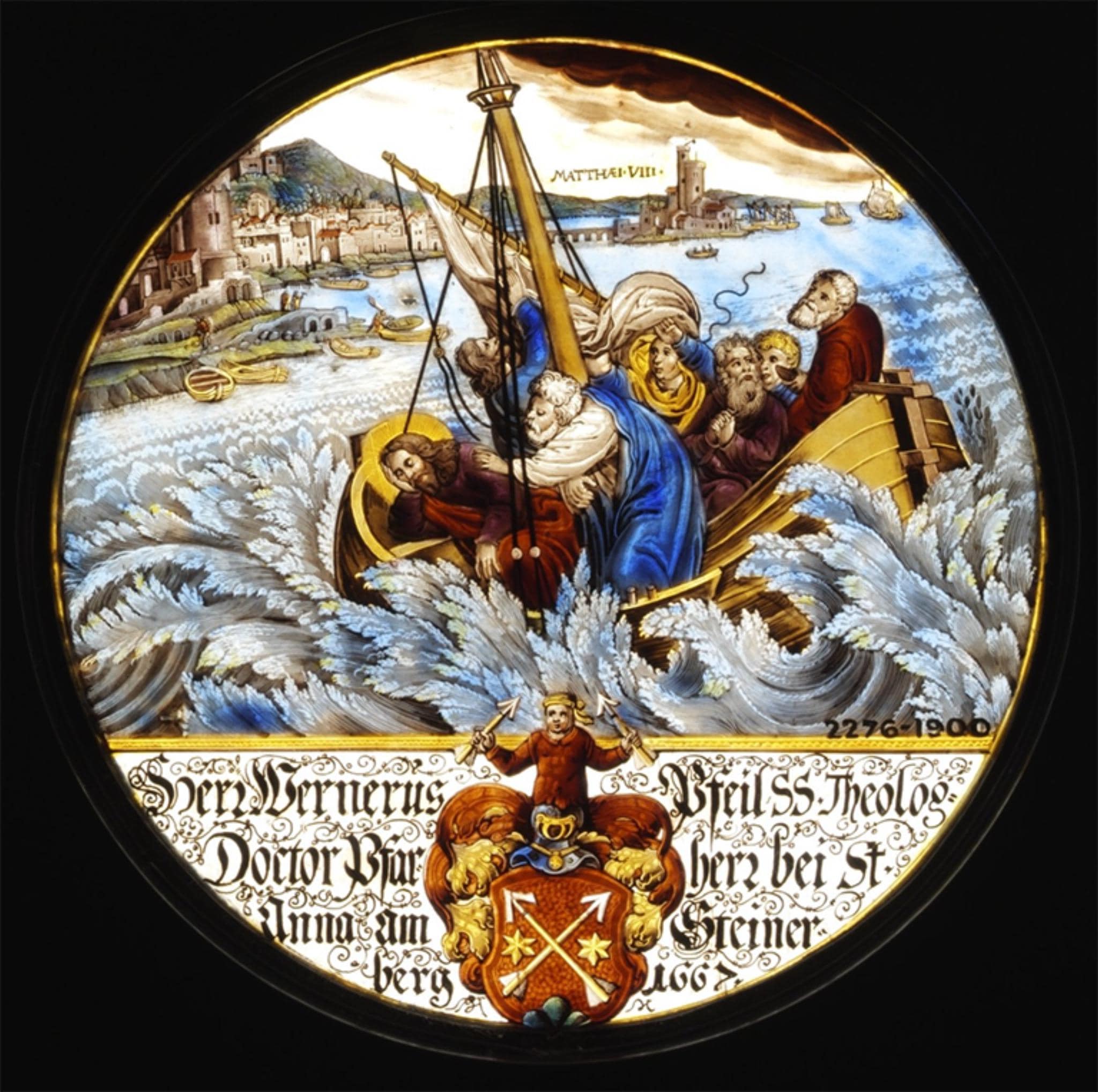 VAM_5: Vitrail historié aux armes de Werner Pfeil : le miracle de la tempête apaisée par le Christ · Bildscheibe Werner Pfeil: Sturm auf dem See Genezareth