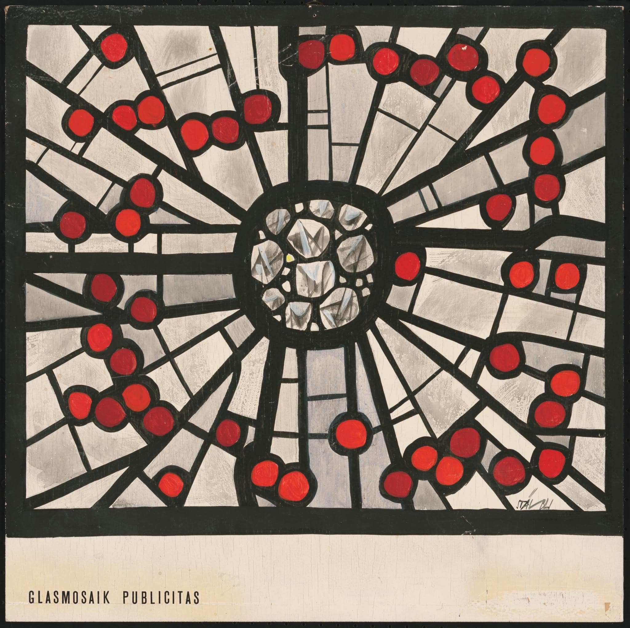 Entwurf für eine quadratische Betonverglasung (Glasmosaik) mit einer abstrakten Darstellung. Von einem mit Kristallen besetzten Zentrum gehen Streifen strahlenförmig aus, die aus polygonalen Formen zusammengesetzt und mit roten Punkten besetzt sind. Dicke schwarze Streifen, die das Quadrat unterteilen, deuten bereits die für die Betonverglasung benötigte Eisenarmierung an.