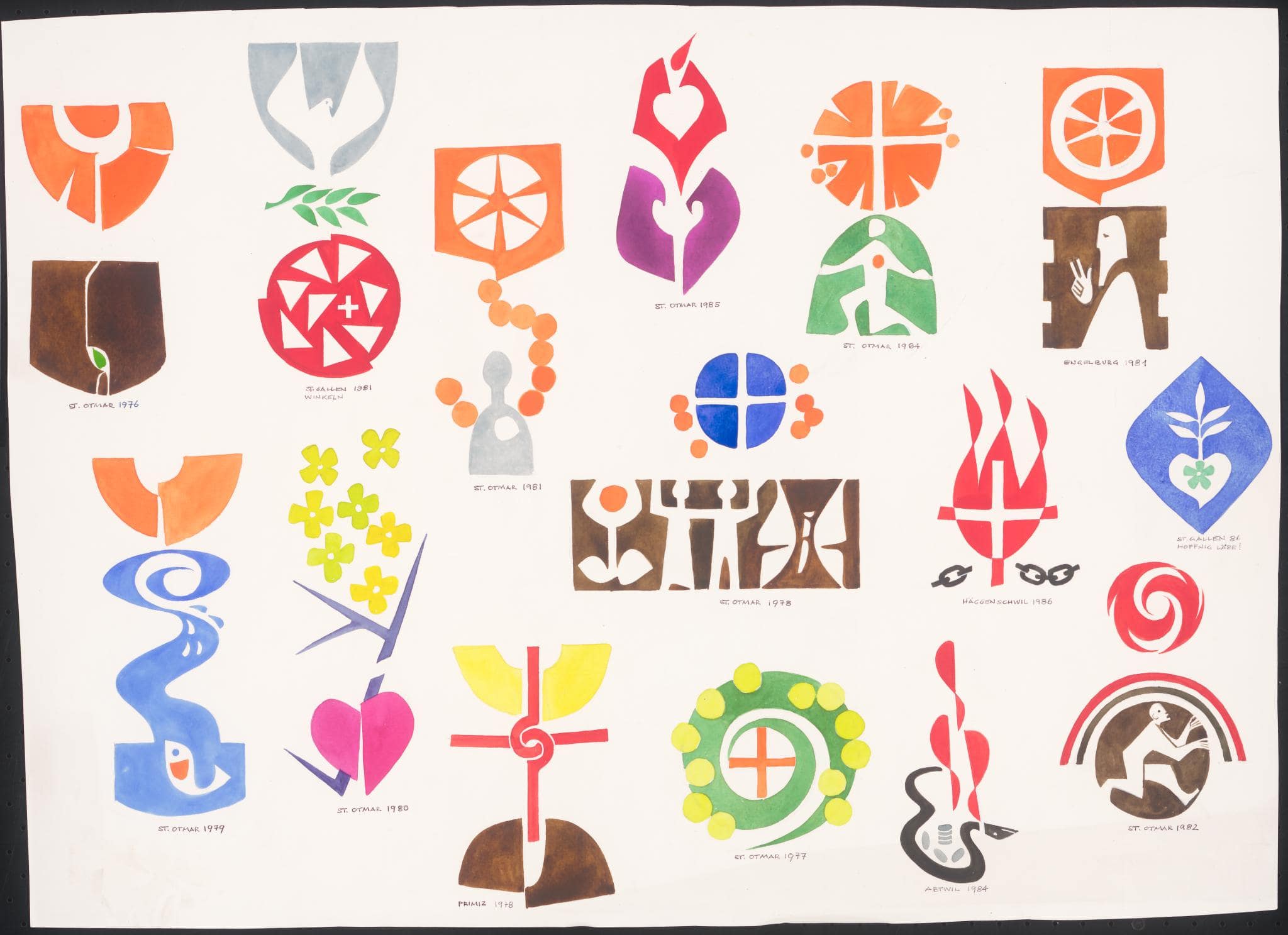 Die Collage vereint diverse Osterkerzensignets und Symbole der Jahresthemen von Kirchgemeinden (St. Otmar, St. Gallen-Winkeln, Engelburg). Die Motive sind in der Regel abstrahiert und nehmen Bezug auf die christliche Ikonografie (Kreuz, Wein als Blut Christi, Taube, Sakramente). Die Signets, Symbole und Logos datieren aus den Jahren 1976 bis 1986 und wurden vermutlich nachträglich in dieser Collage zusammengeführt.