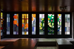 Entwurf für eine neunteilige Glaswand mit grau-bläulicher Ornamentverglasung und vier farbigen Darstellungen. Im ersten Fensterfeld eine Getreideähre und ein Kelch mit Wein als Symbole der Eucharistie. Im Zentrum der Wand ein rotes Kreuz in einer Lichtkugel mit grossen orangefarbenen Punkten. Daneben schwebt eine grüne Kugel, wie ein Erdball mit Dornenkranz, umgeben von Punkten und Blätterformen. Oberhalb der Erdkugel wurde der Entwurf ausgebessert.