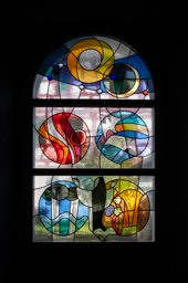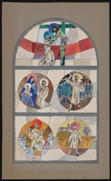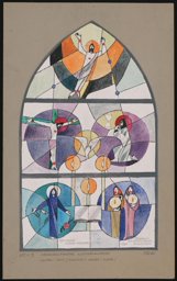 Entwurf für ein Spitzbogenfenster mit Darstellungen der vier Elemente in Kreisformen, von links oben Feuer (rote Wellen und Sonne), Wind (Regenbogen mit zwei weisse Tauben im Flug), Wasser (schwarze Regenwolken, Regen und Fluss) und Erde (Getreide, Weinrebe in Gelbtönen). Zwischen Wasser und Erde eine kniende Schwester im rückseitigen Dreiviertelprofil, die ihre Hände zum Gebet erhoben hat. Im Fensterscheitel die Darstellung eines Sichelmondes und einer kreissrunden gelben Sonne mit weissem Kern, darum Sterne.